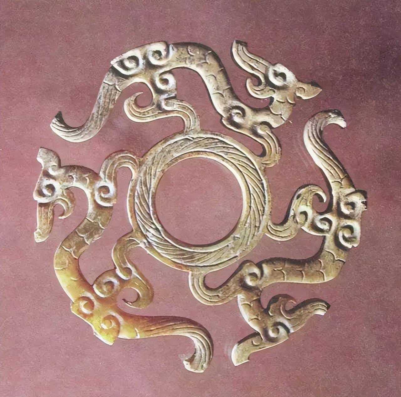 杨公乡出土的玉龙形角嵩更体现了造型创意上不拘常形,富有创新精神的时代特色,过去所见之觿多为外形规整的角状形,纹饰也主要采用线刻的方法,如河南光山县宝相寺黄君孟墓出土的一对春秋早期的玉冲牙,形似牙,以平面双勾线刻出一张口侧身的夔龙。古代玉冲牙与玉觿的差别主要在用途上,形制上基本一致,玉冲牙佩于身上为使其与其他玉器碰击而发出铿锵之声:而玉觿既可用以解结,又是一种佩饰,并有解疑排难之寓意。与黄君孟玉冲牙及其他传统觿形制相比,杨公乡的这件玉龙形角嵩在造型上作了大胆的变化处理,龙形作俯首曲体状,似凌空跃起,突破了传统的规则弧面,并巧妙地与月牙形角嵩体相融合,玲珑剔透,独具韵味(图3-10)。其他战国墓出土的“龙凤形玉佩饰”也很多,如上面提及的曾侯乙墓出土的“玉四节佩”便是以龙为主体造型,并与鸟、蛇等内容相组合,是战国早期玉佩精品之作(图3-11)。另外,中山国国王墓中出土的一件“玉透雕三龙环形饰”也是颇具特色的作品,该玉饰中间为一圆环,环外有三条回首拱体卷尾的透雕龙,形态相同,作爬行状旋转排列,形象十分生动,富有很强的运动感。(图3-12)