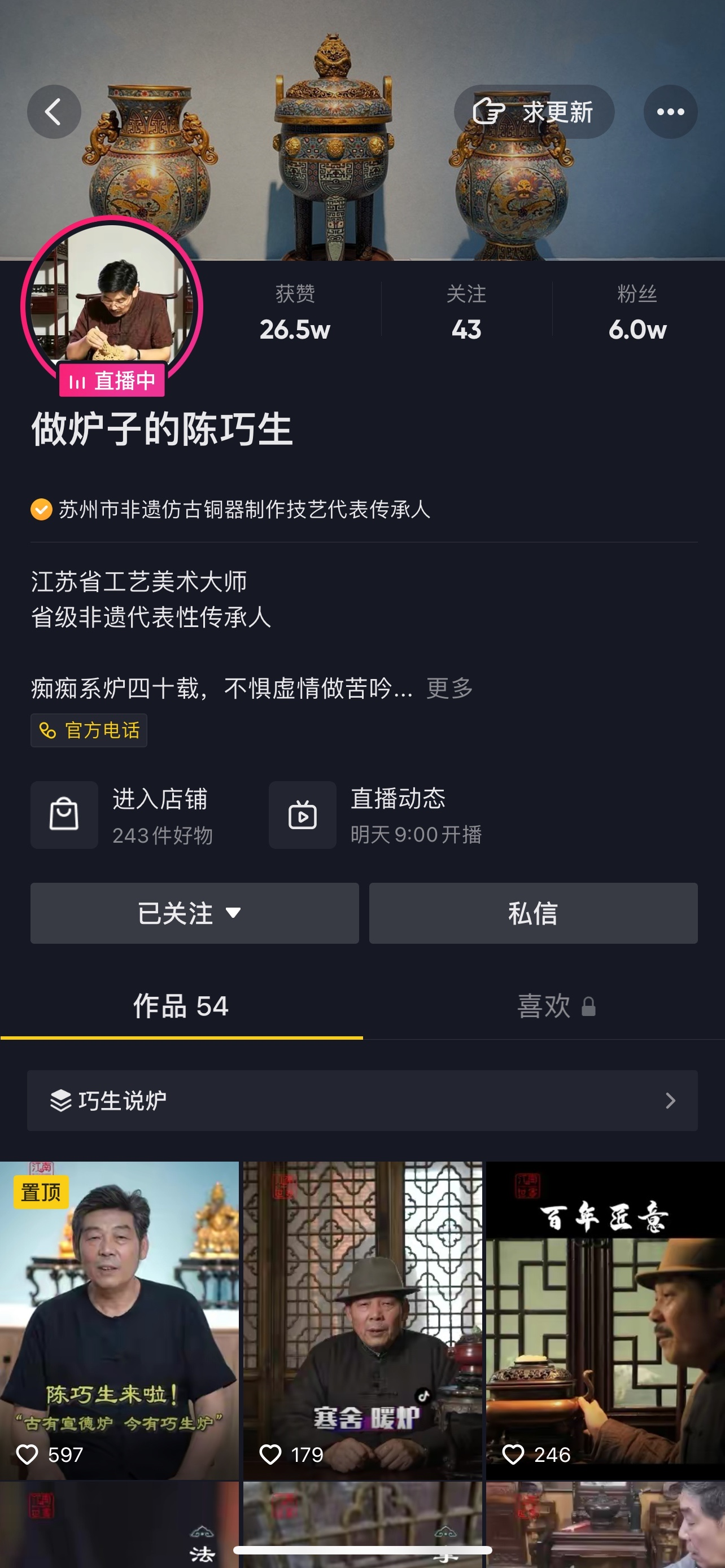 借助抖音电商资源支持,向更多人推广炉文化让陈巧生惊喜的是,通过抖音电商,他发现有越来越多的00后年轻人也开始对铜炉感兴趣。“现代生活节奏太快,看炉、玩炉,其实可以让我们的生活也慢下来一些。”