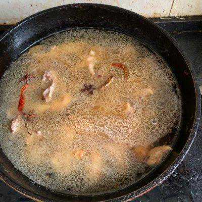 5、锅烧热、放一点点油、把刚刚捞出的鸡肉倒进去炒香,炒的过程中加入大料两个以及姜片干辣椒适量、炒到闻到鸡肉的香味后,鸡皮有收缩现象,这样目的是吃的时候不肥