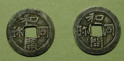 和同开珎,看起来好像和唐朝的货币在叫法上不一样。其实同是汉字铜的日本简化字,珎是宝的简化字,就是说,其中的意思是“和铜开宝”,其直径大约24毫米,材质主要是青铜。从设计到铸造,基本就是仿制唐朝的。