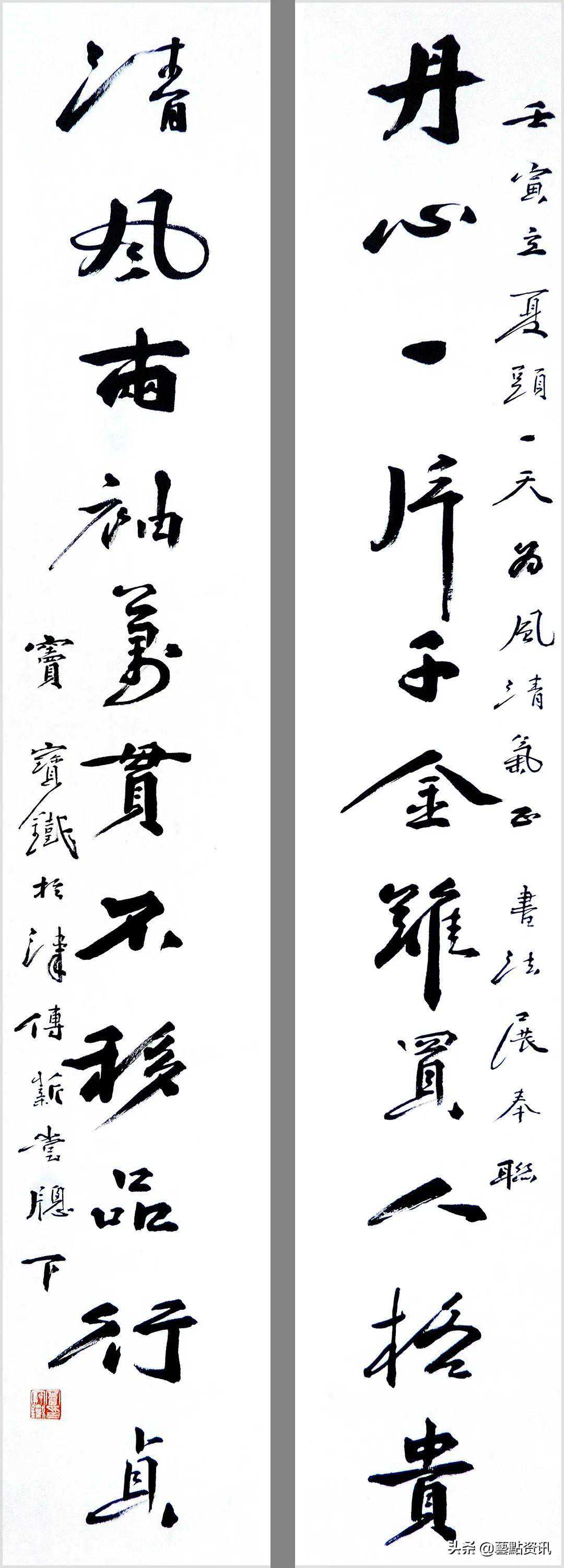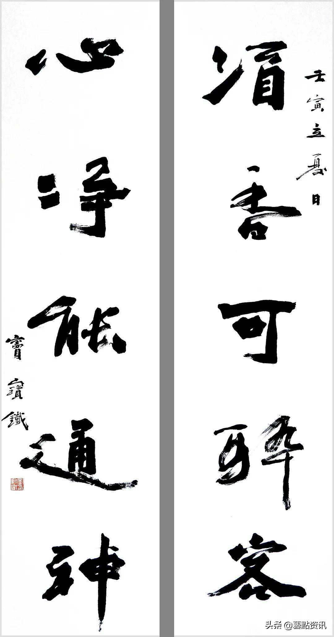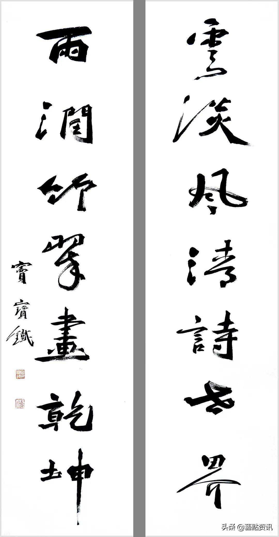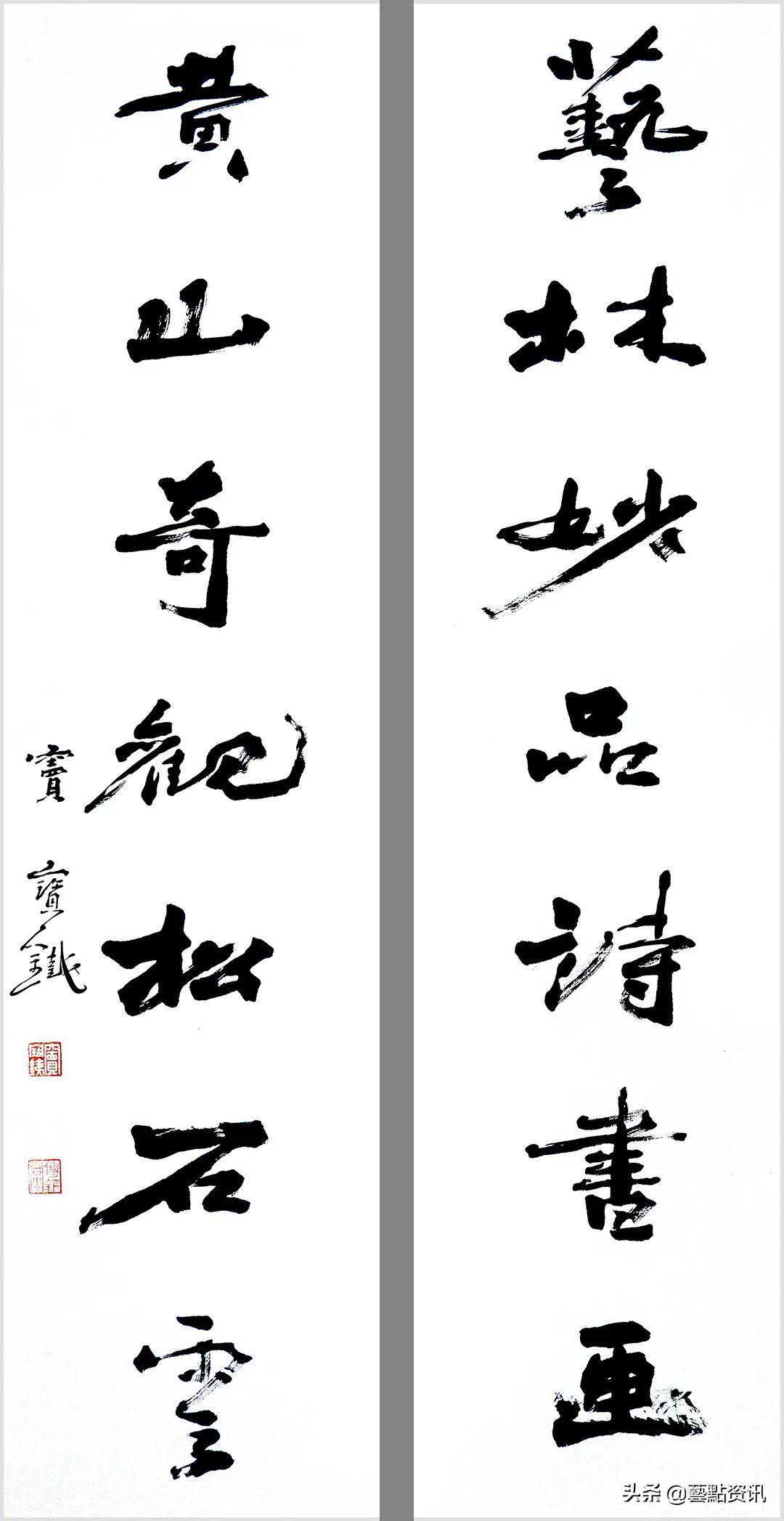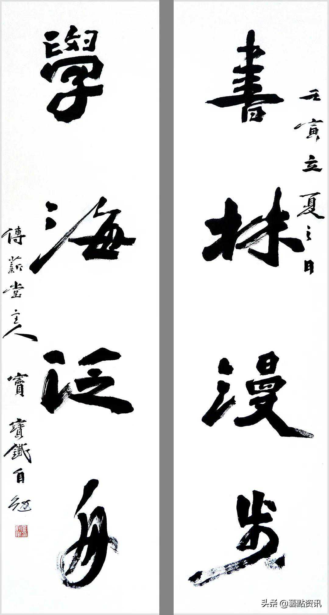 中国书法屹立于世界艺术之林,数千年一脉相承,铸就了中华民族的灵魂。唐人孙过庭“古不乖时,今不同弊”,元赵孟頫“用笔为上,结字须工”,当代书法大家孙伯翔先生“崇尚经典,汲古出新”等圣贤书学精要,是窦宝铁老师书法学习的理论基础。他追随恩师数十载,亦步亦趋,在书法学习的道路上孜孜以求,不断前行,并博取众家之长,融会贯通,渐渐形成自己的书风面貌。今选刊楹联作品30幅,与大家分享。