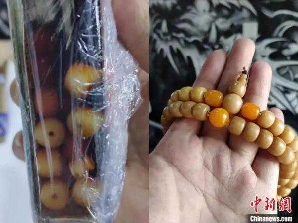 受访者自己用茶水泡的菩提根手串。受访者小王供图。