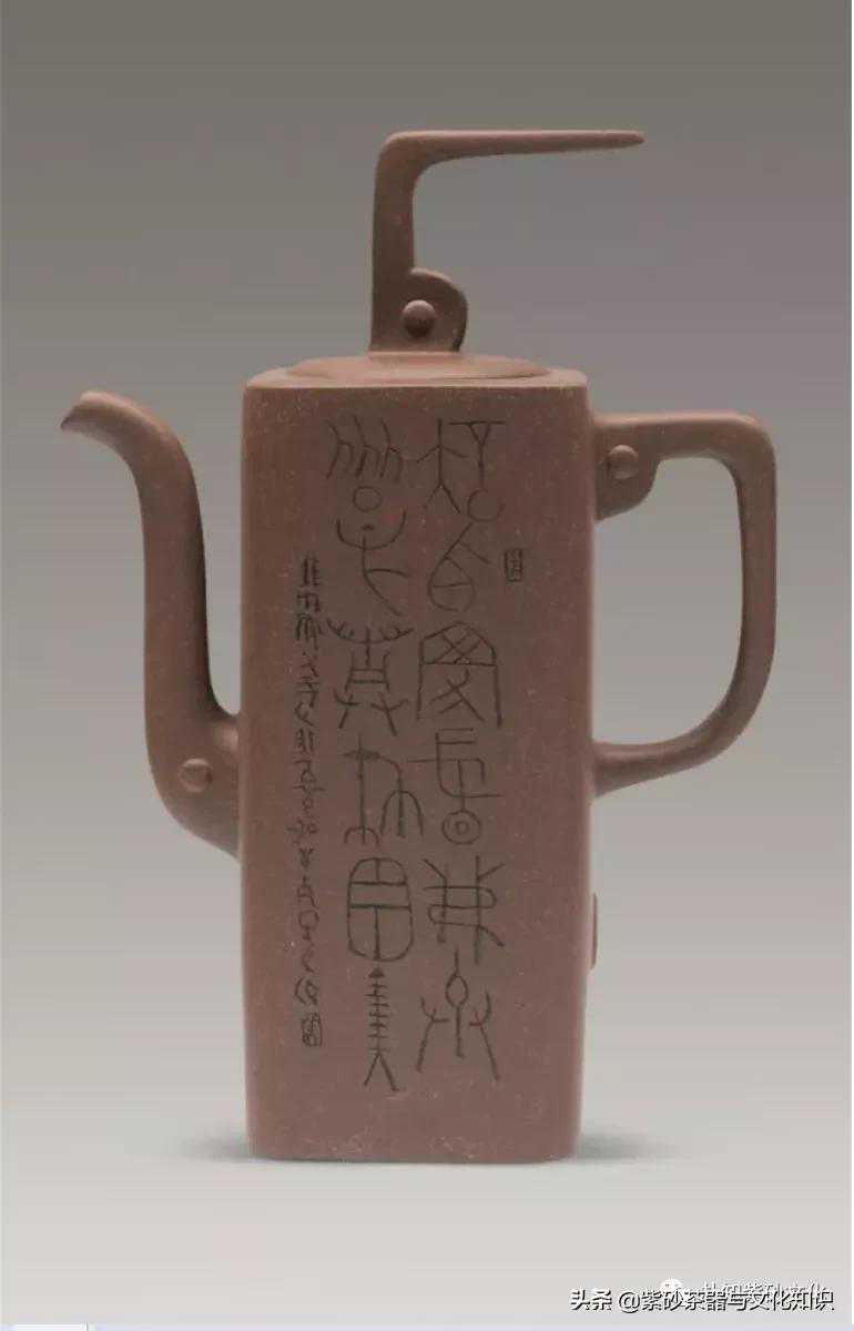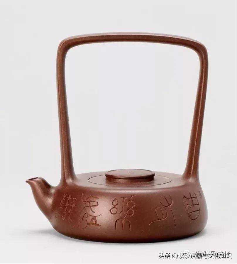 其特点为直线与弧线交错运用,转折处明快流畅。提梁及盖的设计新颖、大方、突出。整体制作形成圆中有方、方中带圆的构图特色,充分掌握运用了雕塑空间关系的美学概念。壶身丰厚扁圆,稳住了上半部的飞扬动势,为整体的造型起到了关键作用。流则浑厚有力。远观此壶有如飞鸟于天之感。