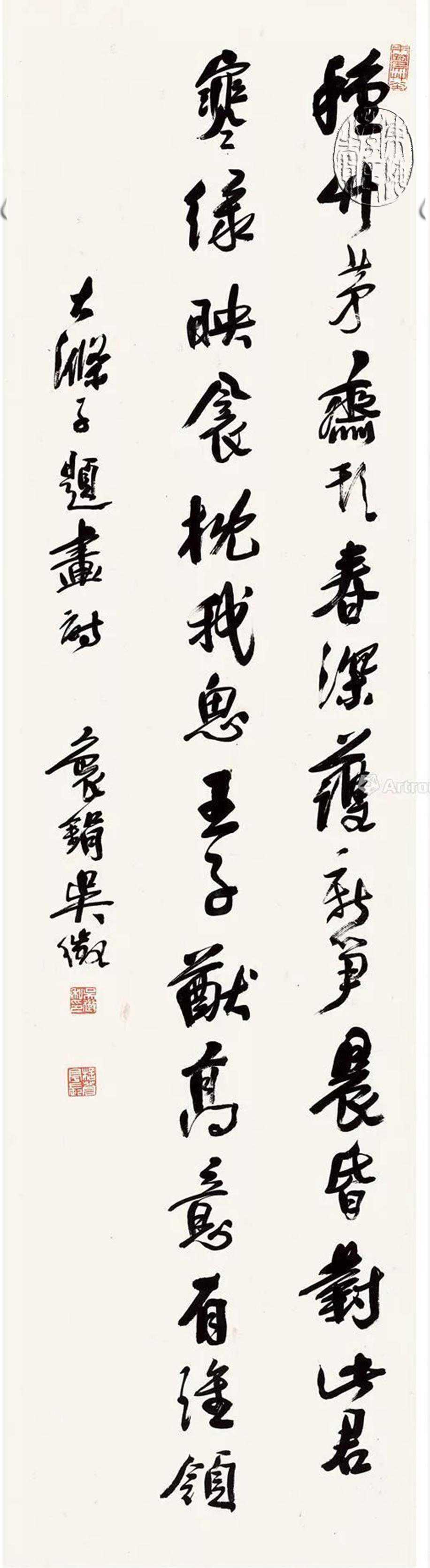 吴徵为吴伯滔之次子。后居上海。山水初传家学,终日作画。手不停挥,无暇构思,以致笔墨僵滞,缺乏意趣。花卉师吴俊卿早年笔墨,又学李(鱼单),后窥元、明诸家,较山水为佳。书法则学王觉斯、倪元璐。亦能治印。