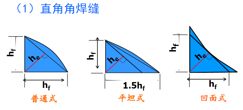 直角角焊缝,顾名思义,截面是近直角三角形的角焊缝。直角角焊缝又可以分为:普通式、平坦式、凹面式三种。