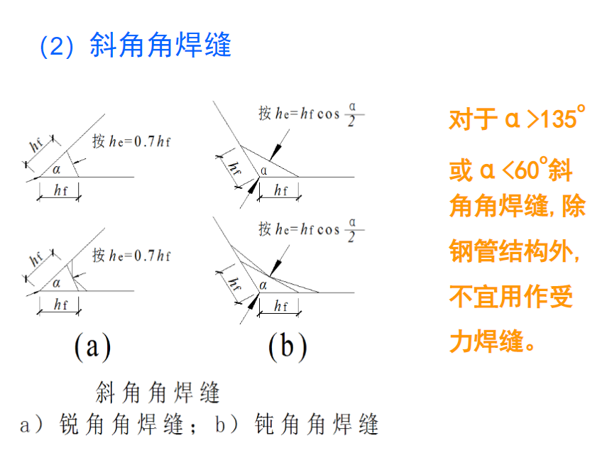 斜角角焊缝,顾名思义,截面是非直角三角形的角焊缝。斜角角焊缝又可以分为:锐角角焊缝和钝角角焊缝两种。注意,对于角度大于135℃或者角度小于60°的斜角角焊缝,除了钢管外,其余不宜作为受力焊缝。
