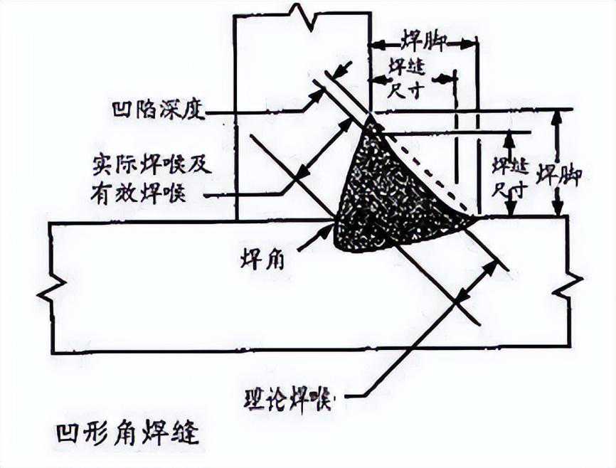 3、凹度:凹形角焊缝横截面中,焊趾连线与焊缝表面之间的最大距离(凹陷深度)。凹度有利于减小应力集中,但是凹度影响焊喉,即影响焊缝厚度,不易过大。