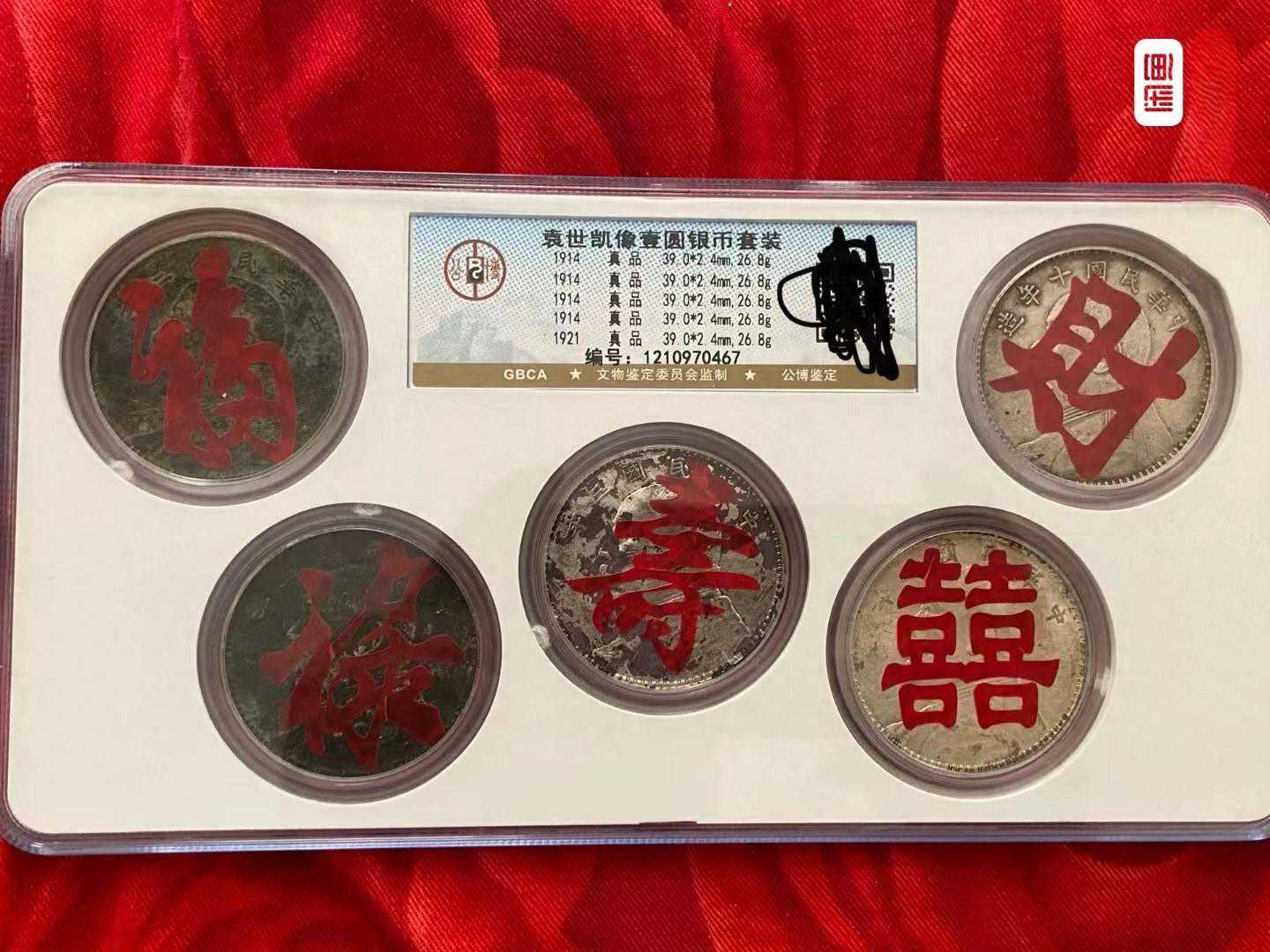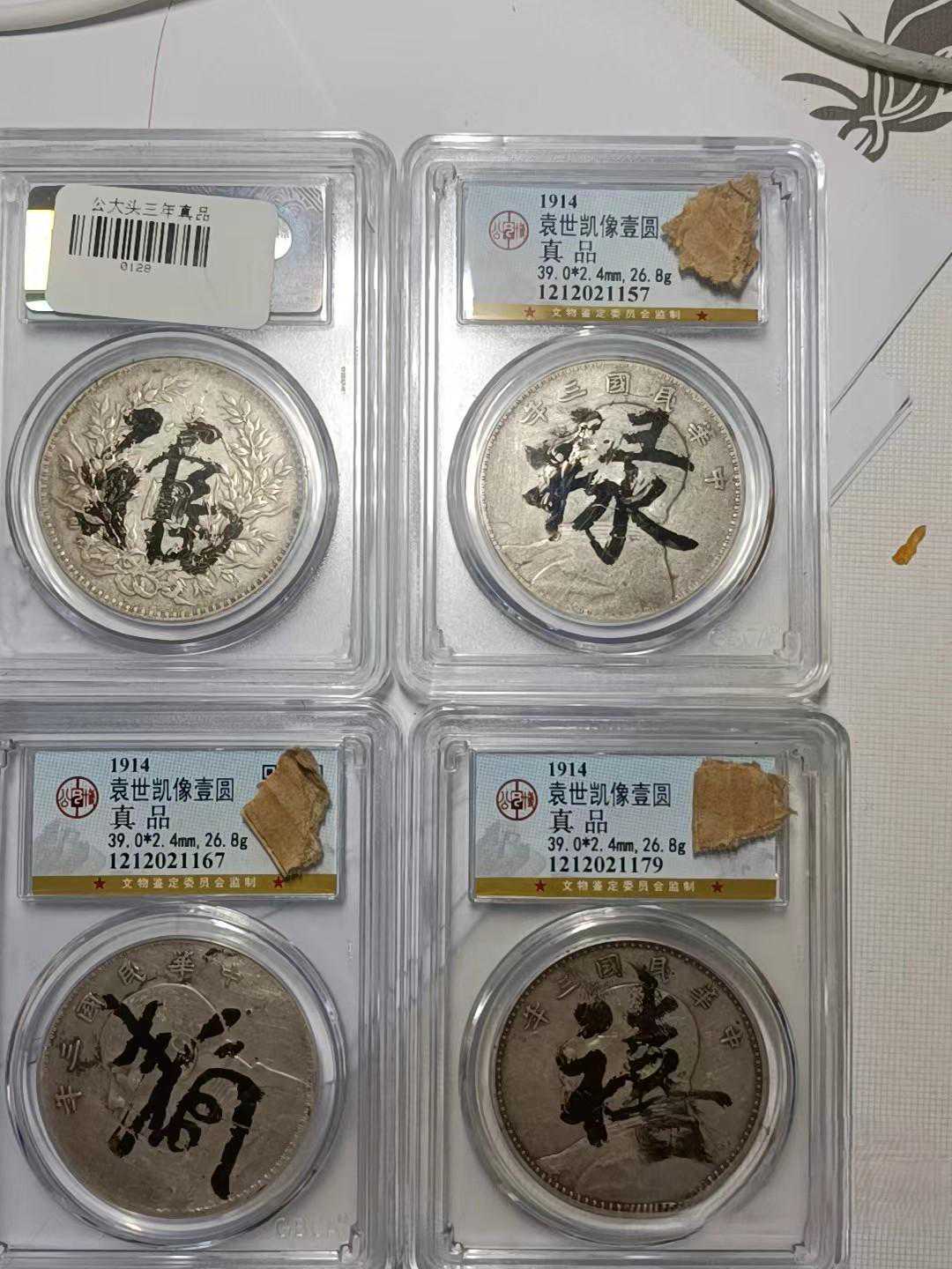 再说墨戳,这玩意最近搞的真是五花八门,财神爷画像都上去了,这种墨戳目前都是想写啥写啥了,和很多国宝帮玩假币一样,告诉他是假的他不信,还说玩的是他的文化价值,敢问造假的东西有什么文化价值。老墨戳有很多传下来的,但是评级盒子标注真品的时候就已经没有什么老墨戳给你留着了,币洗过、擦过了就别信什么老墨戳了,要是什么书法家写写就罢了,迷恋墨戳没有意义的。