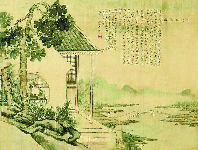 《桐轩品陶图》,温州博物馆藏。民国期间,瑞安士绅沈风锵(字桐轩)《天籁阁诗集》详细记录瑞安集云山发现东晋义熙四年(408年)陶瓷(鸡首壶),并自题《桐轩品陶图》,有“平生爱甓复爱陶”句,一时传为佳话。