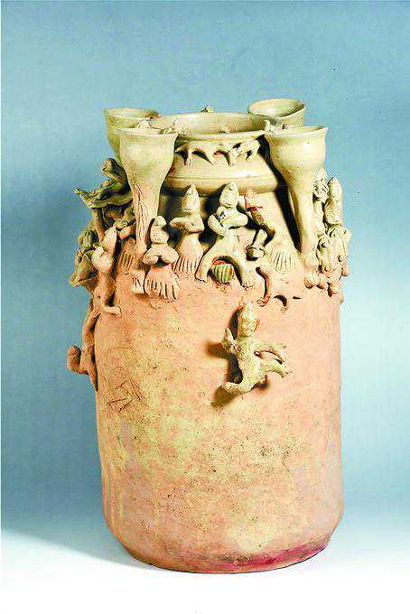 我见过温州市博物馆陈列的一只三国青瓷谷仓上,堆塑着众多高鼻深目的胡人,他们在吹拉弹唱,倒立翻腾,是当时胡人在东南沿海的历史见证。眼前的谷仓显然是另一种。食指的指腹贴上去,跟着眼睛小心地走——四只对称的敞口小罐像欲放的喇叭花,围着大罐形成五联罐,分别装稻、黍、稷、麦、菽。谷仓上原有四只小鸟,已“飞”走了两只。五谷丰登,粮食盈廪,百鸟争食,真是一幅丰收好景象。