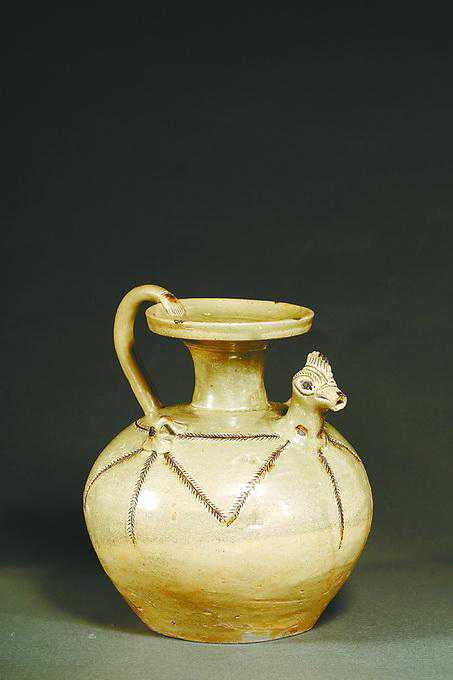 ——饱满的腹部,秀劲的壶颈,形神兼备的鸡首,鸡尾形成流线型的壶把,翎羽从鸡首辐射开去后形成几何图案网住壶身,冠、眼、喙、尾以及翎羽,以褐彩突出。一千多年前,人心与动物相亲成器,如此的古朴秀雅。