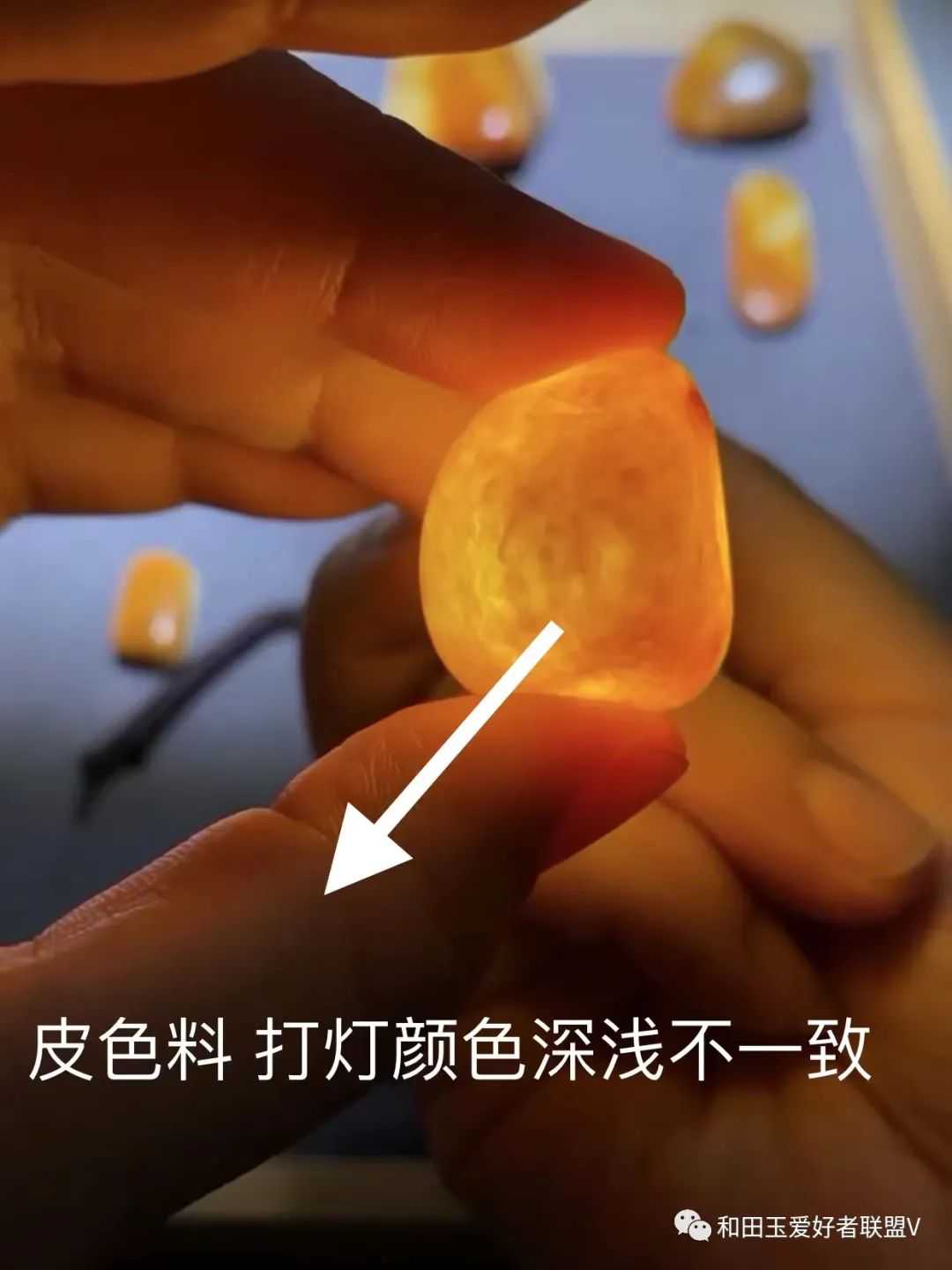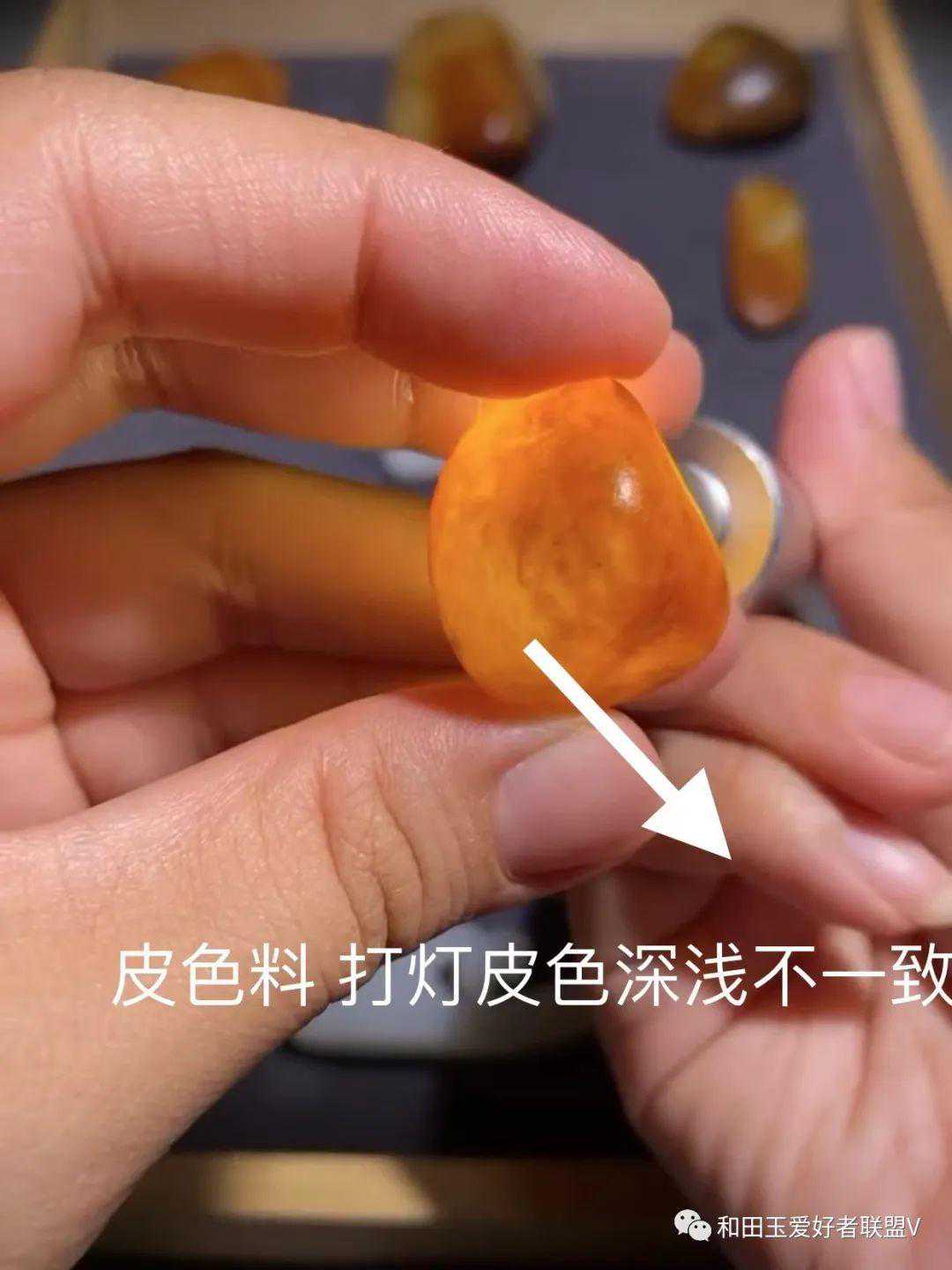 那么,怎么才能分清非常像黄沁的皮色料与黄沁之间的差别呢?依然是看打灯的状态: