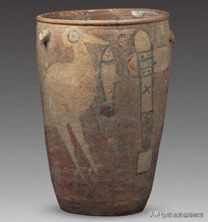 鹳鱼石斧图彩陶缸是用夹砂红陶土盘拉成型,彩绘烧成,总高47厘米,口径32.7厘米,底径19.5厘米,敞口、圆唇、深腹、平底,沿下有四个对称的鼻钮,腹部一侧有一副高37厘米、宽44厘米的《鹳鱼石斧》彩陶饰图。
