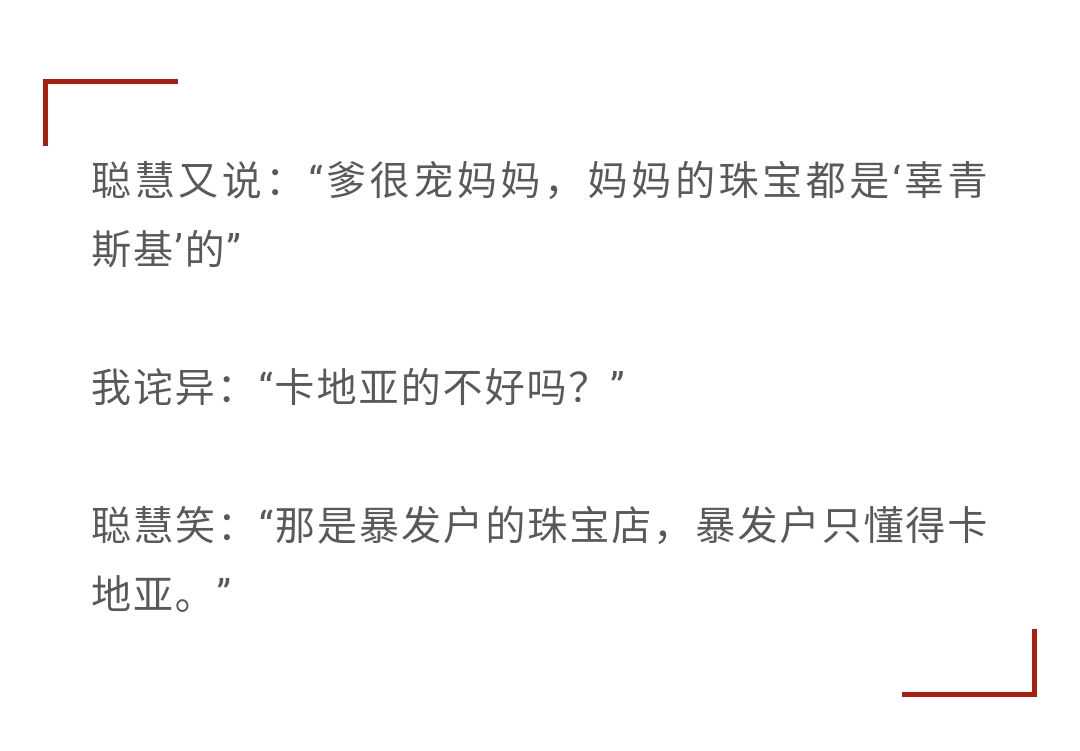 大家记得《喜宝》中勖聪慧里那句“暴发户的珠宝店”,但其实她的言下之意是,暴发户除了卡地亚不会买别的,去卡地亚的暴发户也挺多。其实也就是我上面提到“有钱买但不会买”。