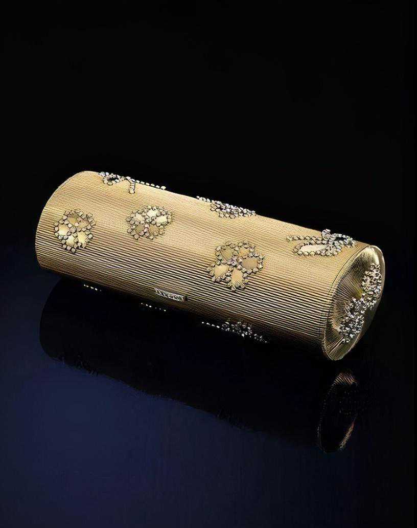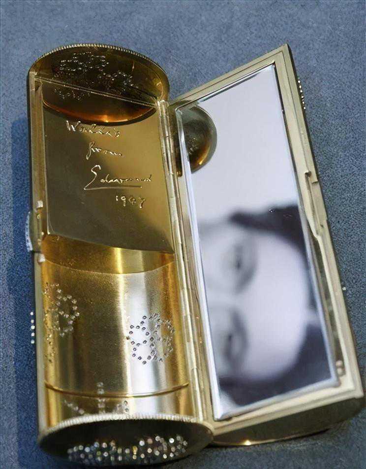 这个黄金手拿盒就是送给夫人的卡地亚定制小礼物之一,参加舞会的时候装口红用,打开来里面有温莎公爵的签名。