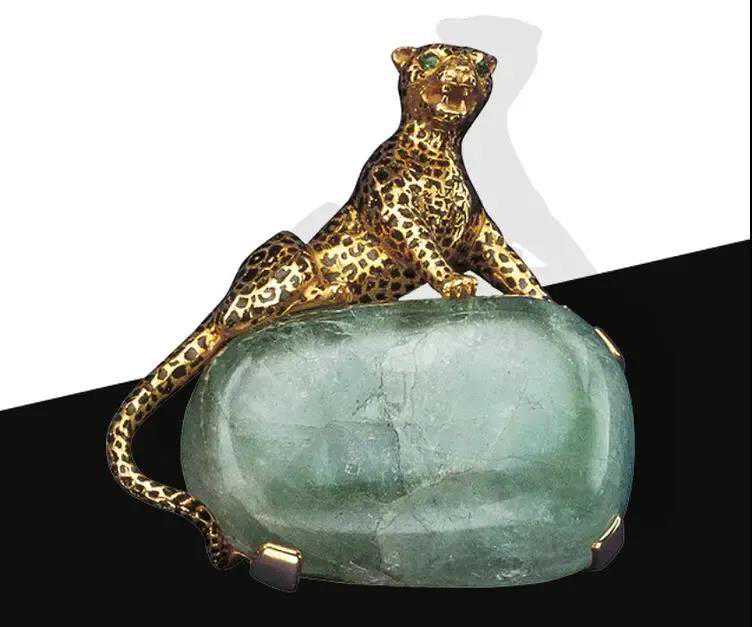 1948年,第一件真正意义上的立面猎豹珠宝问世。这是贞·杜桑为当时的名媛、传奇女性温莎公爵夫人打造的第一枚猎豹胸针:它身披金色和黑色斑点,瞪大镶嵌祖母绿的双眼,蹲在一颗重达116.85克拉的天然祖母绿上。