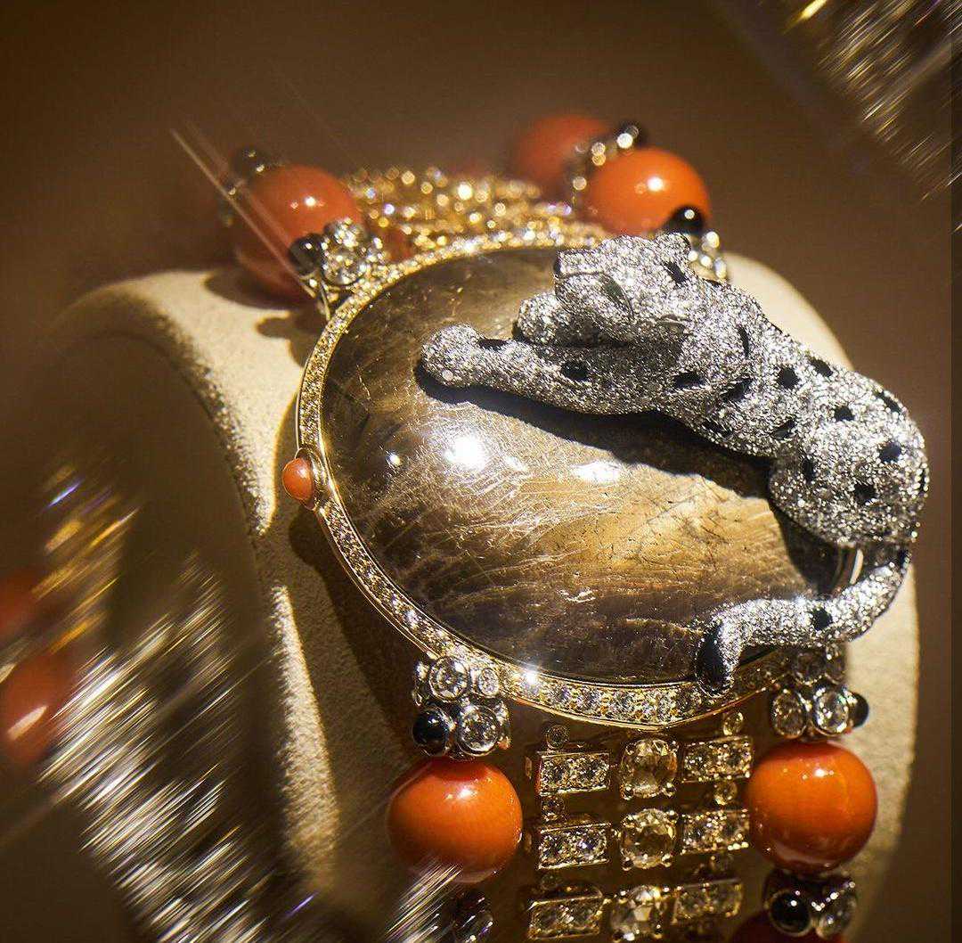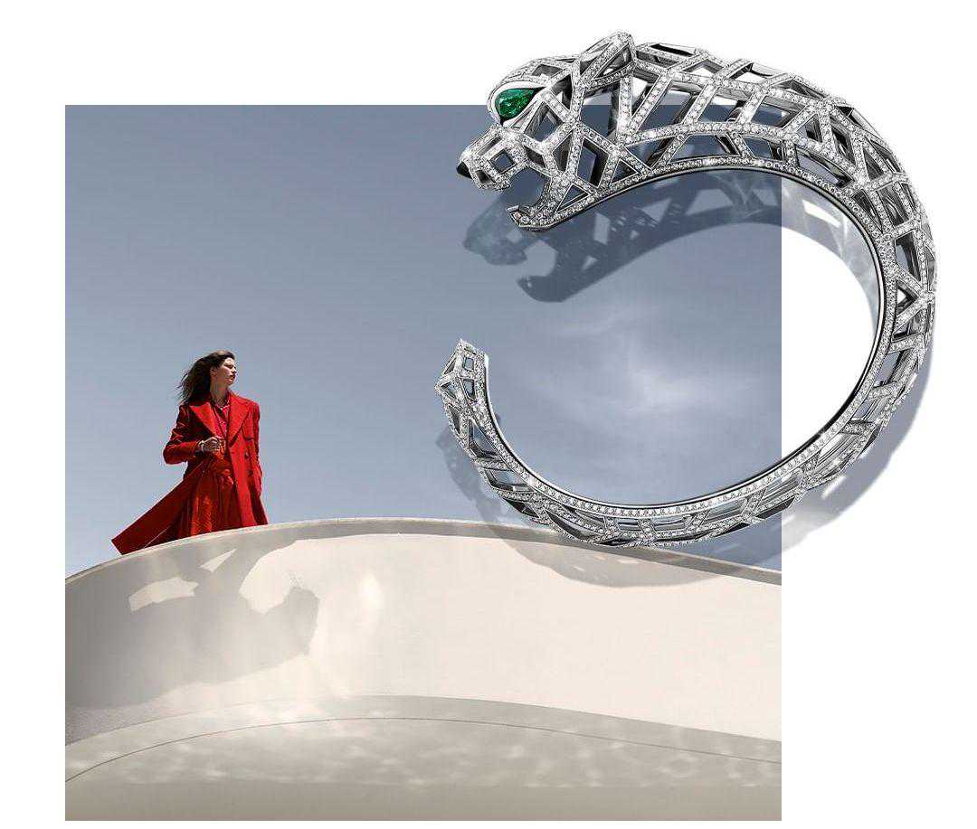 一位身着时髦束腰长裙的美女,捧起象征纯洁的三层珍珠项链,脚下伏着一只黑色的猎豹。从此,卡地亚把猎豹视为女性意识的苏醒,将其与珠宝这一永恒的女性表达联系在了一起。