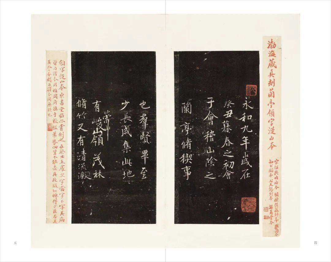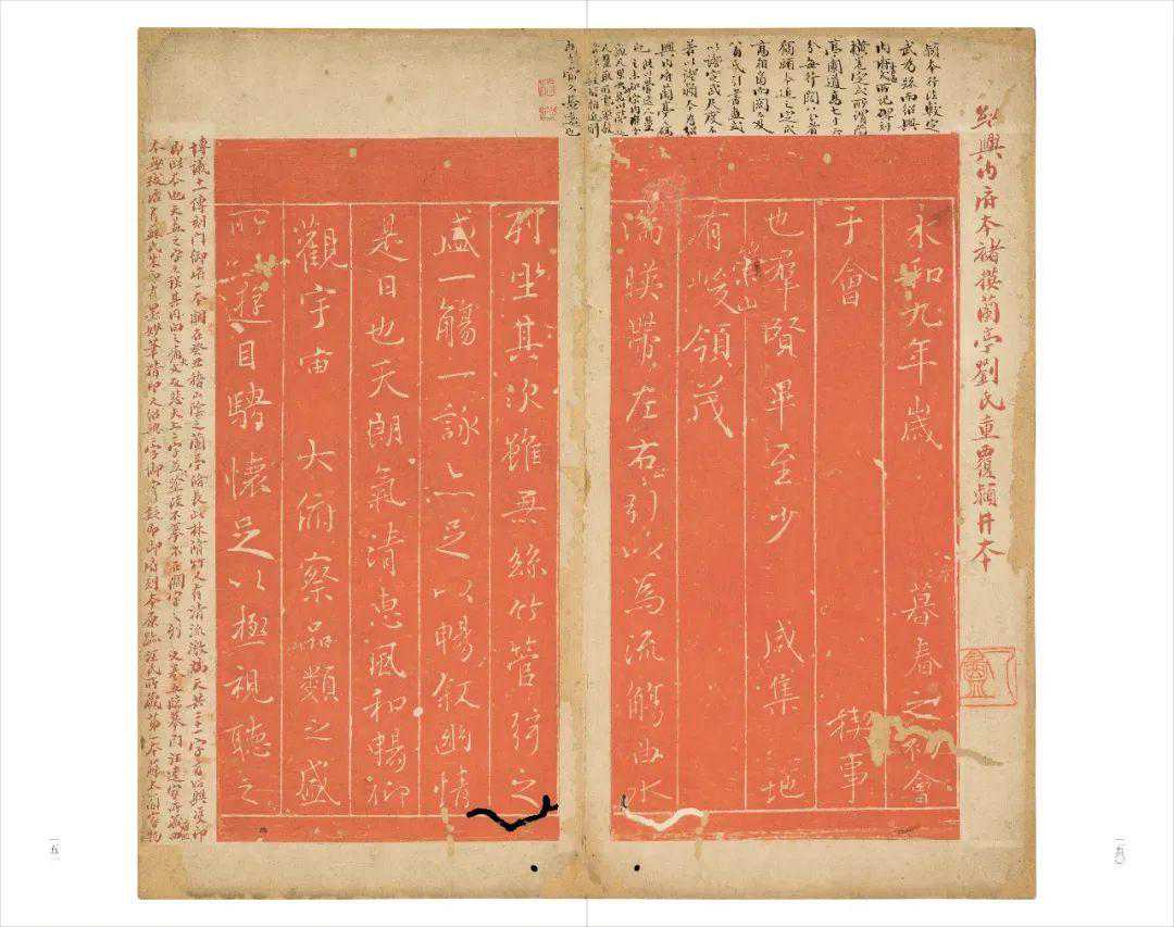 在海日楼旧藏碑帖中,各种不同版本的《兰亭序》数量不少,成为一个颇具特色的专题系列。清中期碑学兴起后,李文田等人虽对《兰亭》的真伪一度产生质疑,但并未动摇其作为经典法帖的地位,故依旧受到文人学者的景仰和师法,即便如翁方纲、桂馥、何绍基、吴云等碑派名家,也都十分热衷于收集《兰亭序》的各种不同刻本、摹本,品骘考鉴,以为雅事。沈曾植对王羲之的书法十分推崇,曾以佛家中的慧能喻王羲之,视《兰亭》乃“人间第一等鸿宝”。浙博藏海日楼碑帖中,《兰亭序》拓本有四十余种之多。这些拓本上多有沈曾植批校题跋,内容或评其书法优劣,或考其版本源流,或校其笔画差异,有的还是借来善本校勘后所记。