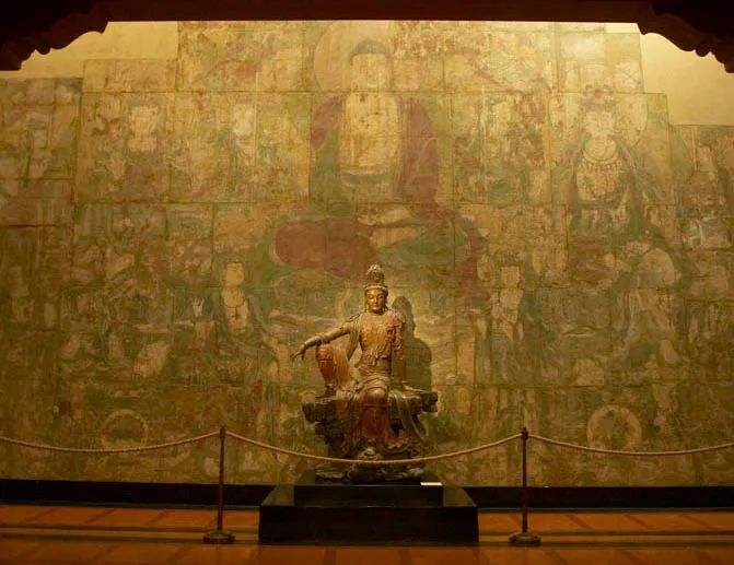 如中国寺庙画廊陈列着一尊金代木胎彩绘菩萨像(下图中间),高达305cm,为中国存世高古木造像中体量最巨,雕工最精的稀世之作。