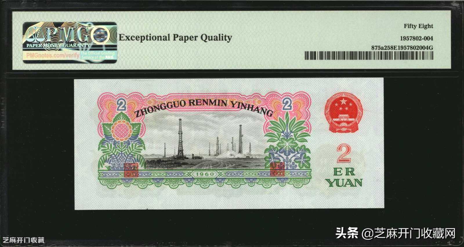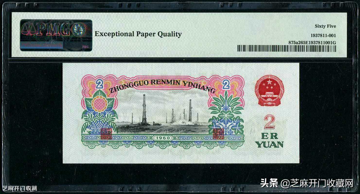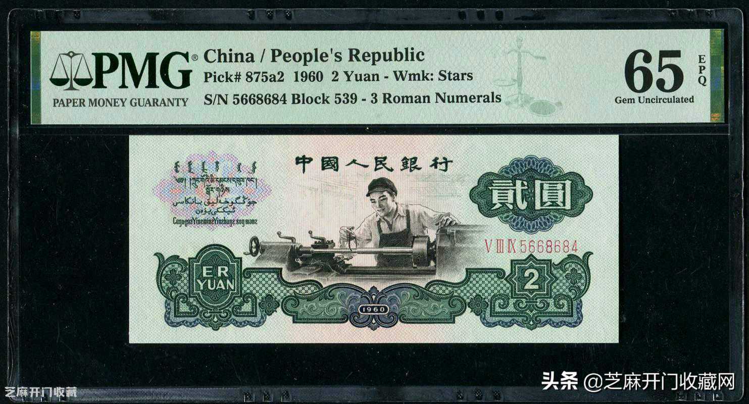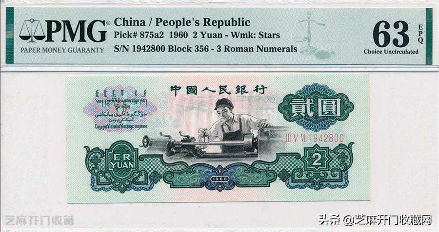 1:第三版1960年2元PMG65EPQ(五星水印),估价:RMB1700-2500,成交价格:RMB1819