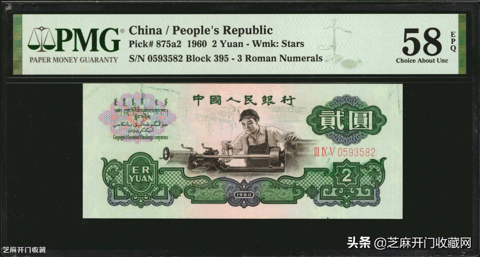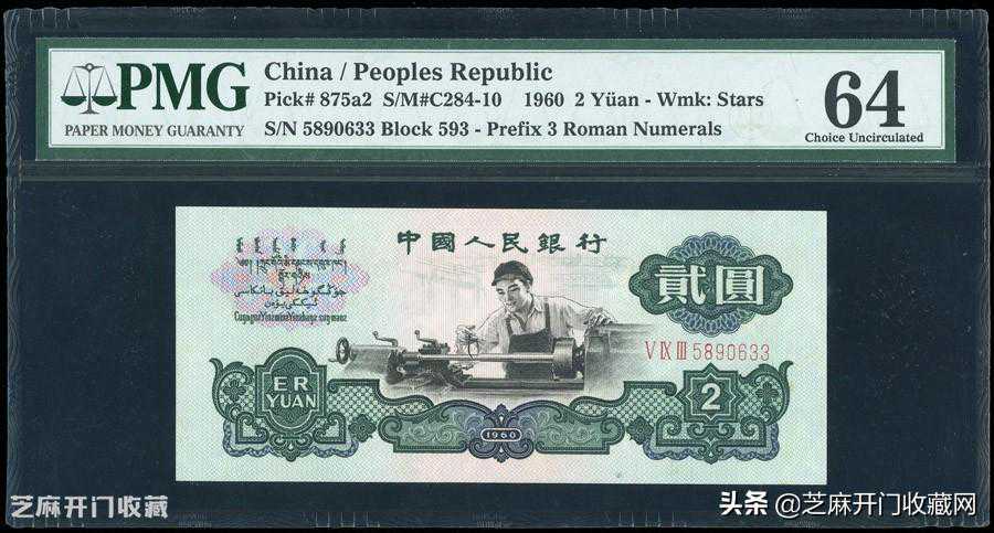 2:1960年中国人民银行第三版人民币2元,星水印,编号VIXIII5890633,PMG64,成交价格:HKD2160
