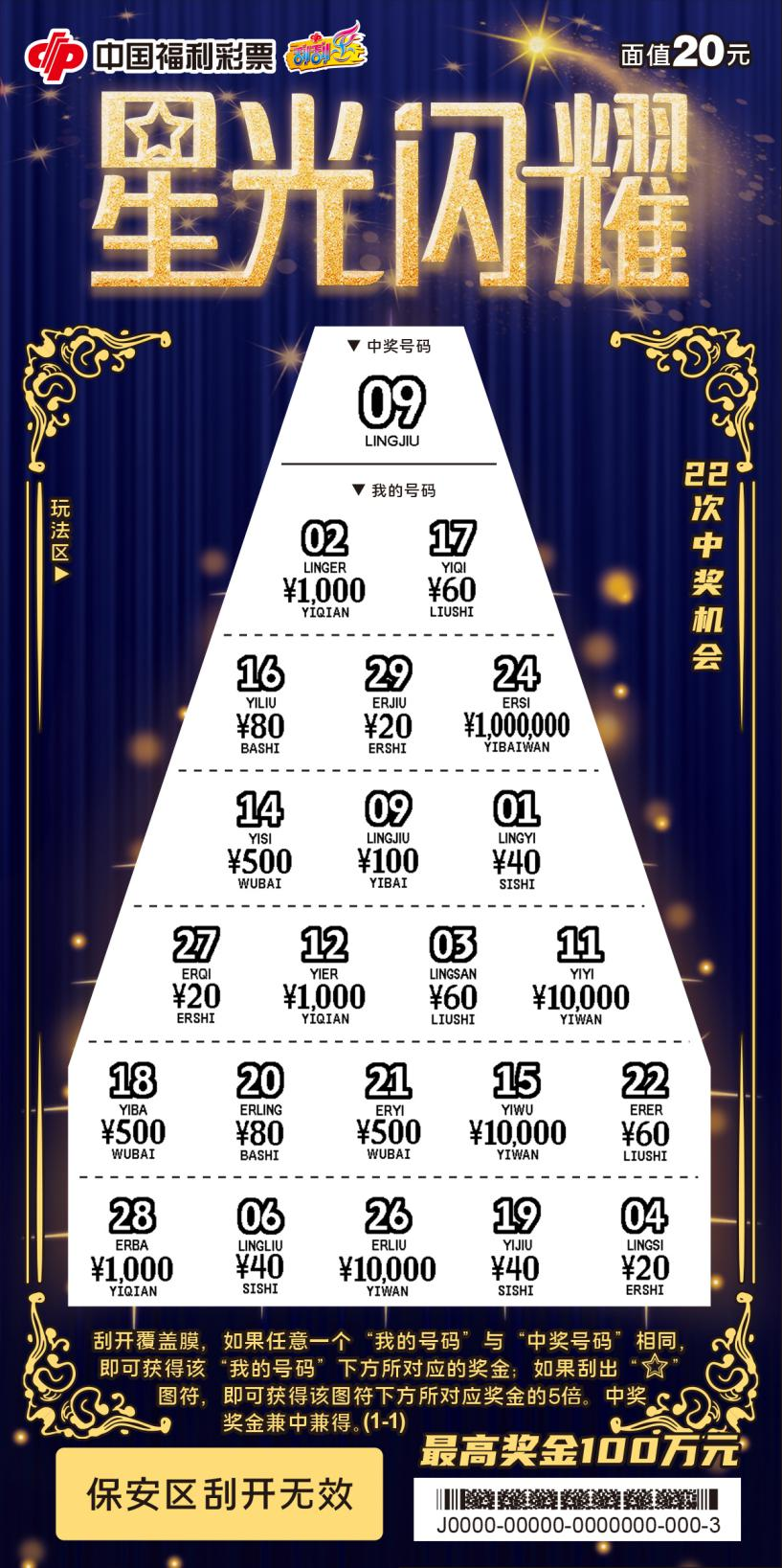 该款彩票面值为20元,单张彩票有22次中奖机会,中奖面为35.24%,返奖率为65%,最高奖金100万元。