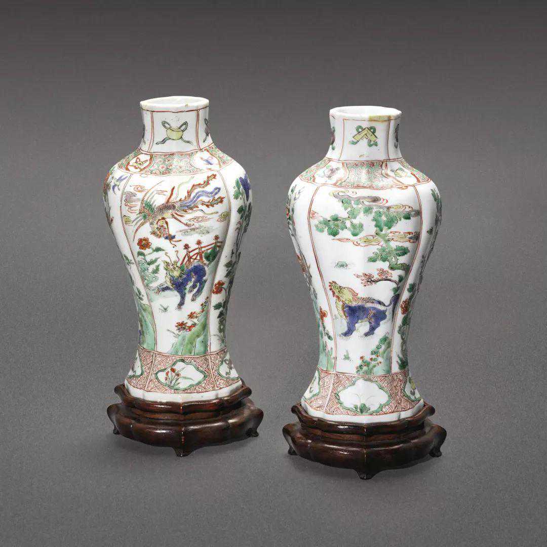 Lot22清康熙五彩瑞兽图瓜棱瓶一对