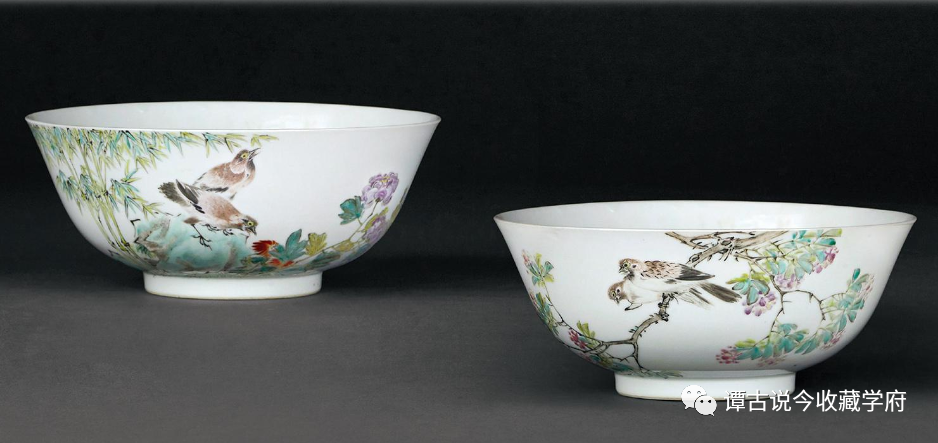 清浅绛彩花卉双雀图碗一对