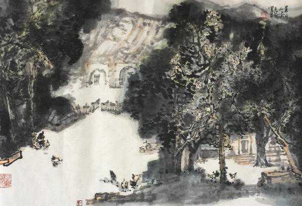按照这样的创作理念,蔡长海对图稿进行调整,树木虚写,大量留白,大殿突出,最终成稿呈现,已经是一幅成熟的艺术作品。