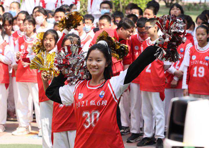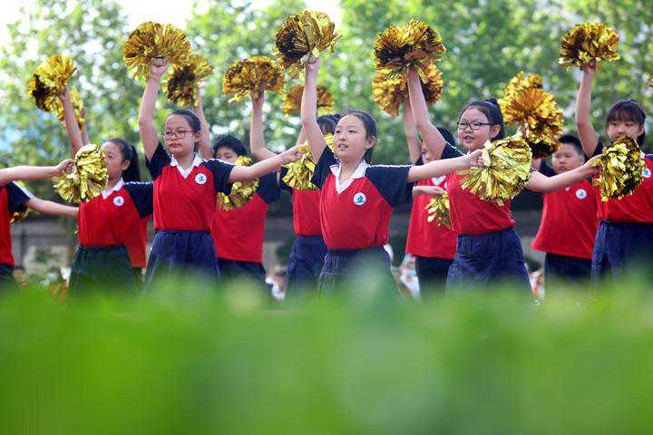 2021年4月29日,在石家庄市华兴小学,学生们参加校园啦啦操比赛。新华社发梁子栋摄