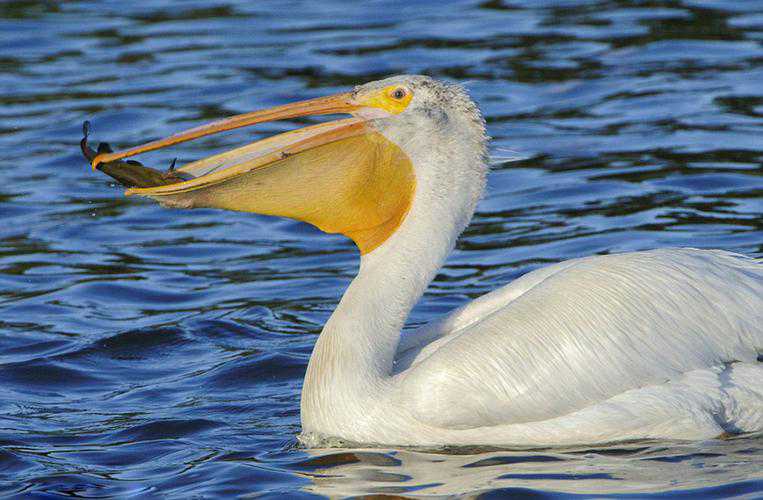 其实我们从侧面看鹈鹕他的会也就是他的嘴巴的确很长,但如果要说他嘴巴很大,我就要要纠正一下大家。严格意义上的讲,真正塑造了鹈鹕大嘴形象的是附着在下颌的大口袋,这个大口袋叫做喉囊,它是由上皮组织组成,极富有弹性,从下颌尖端舒展延伸,甚至直达鹈鹕细长颈部的极下端,喉囊的容量是鹈鹕内部的容量两倍还要不止,因为没有其他鸟类这样可以上下开合的嘴巴,所以在捕食过程中鹈鹕喉囊发挥着巨大的作用。