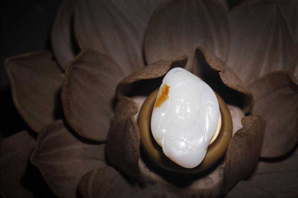 而和田籽料所独有的温润之感,更让观音的形象既有神明的恬淡气息,又有着凡人的生动表情,透露着生活气息。