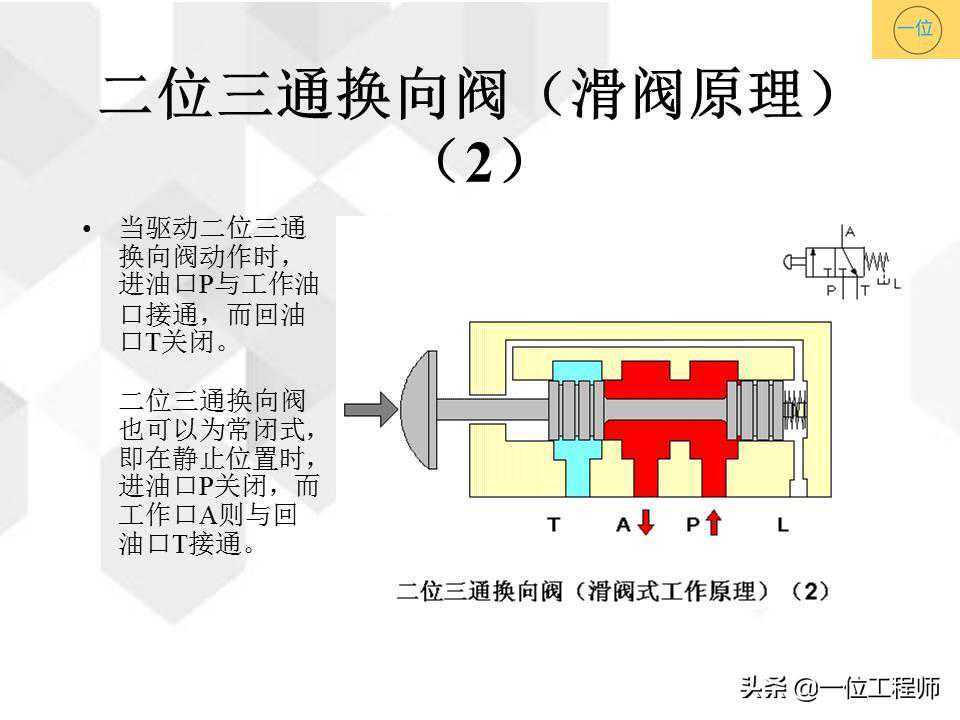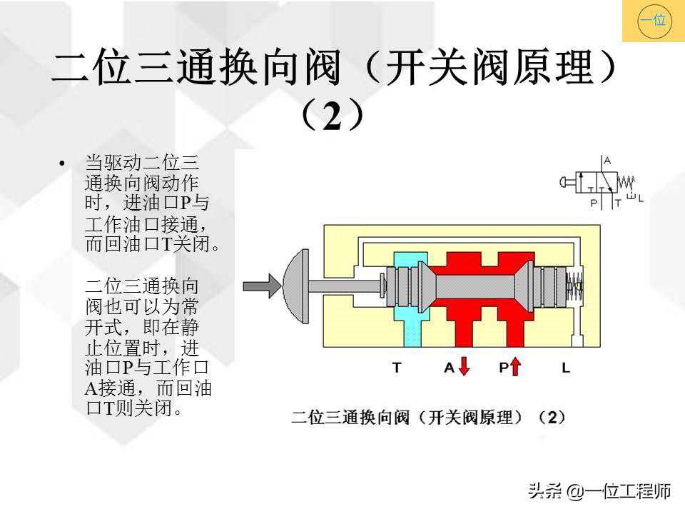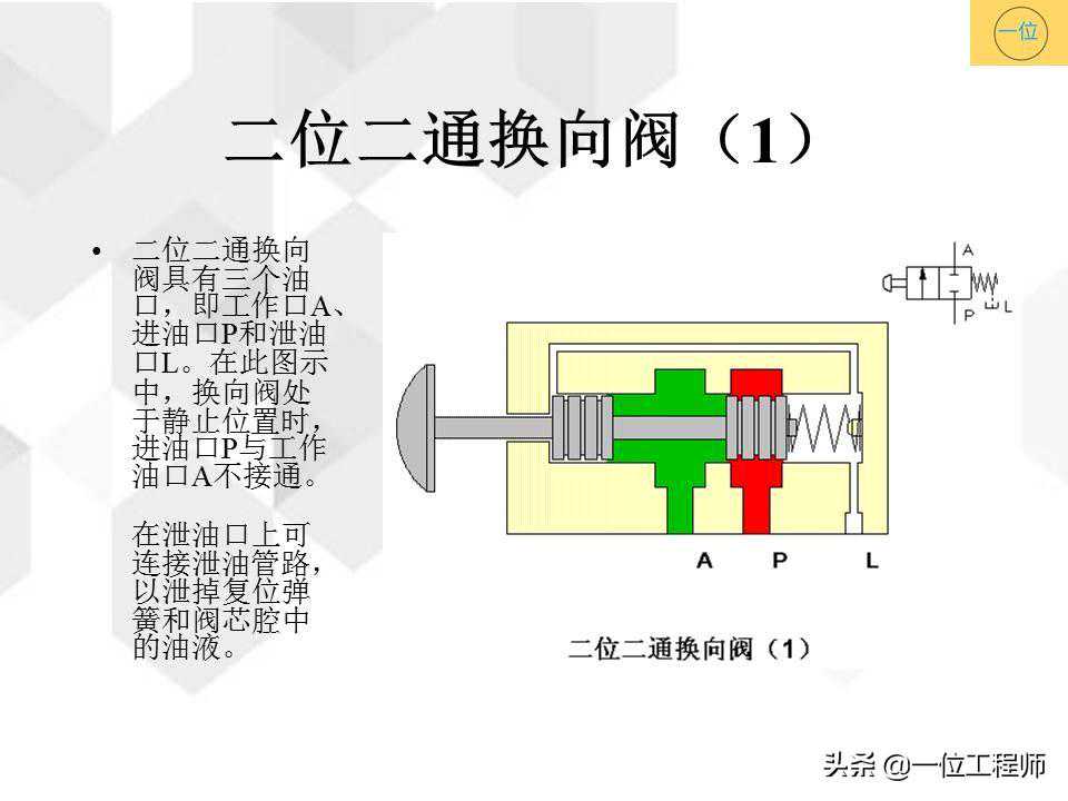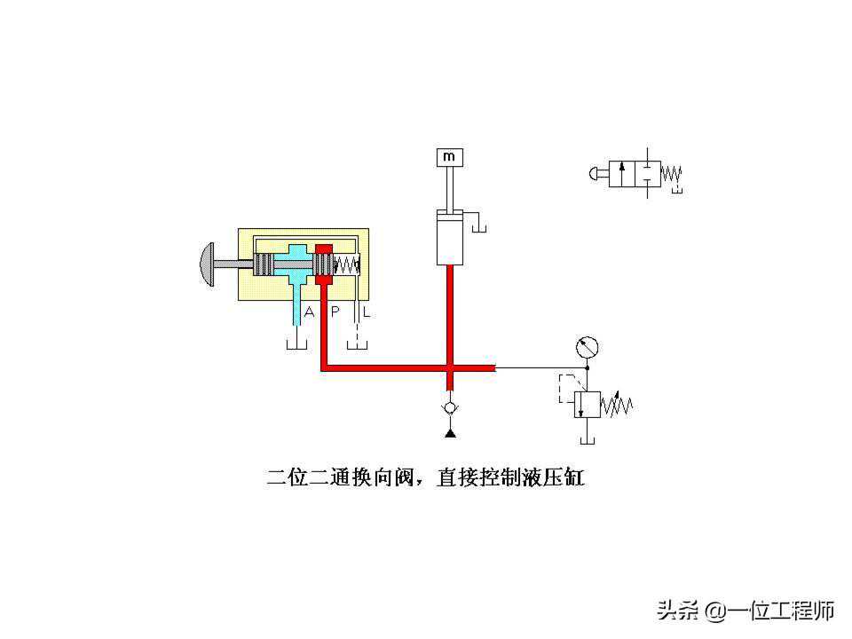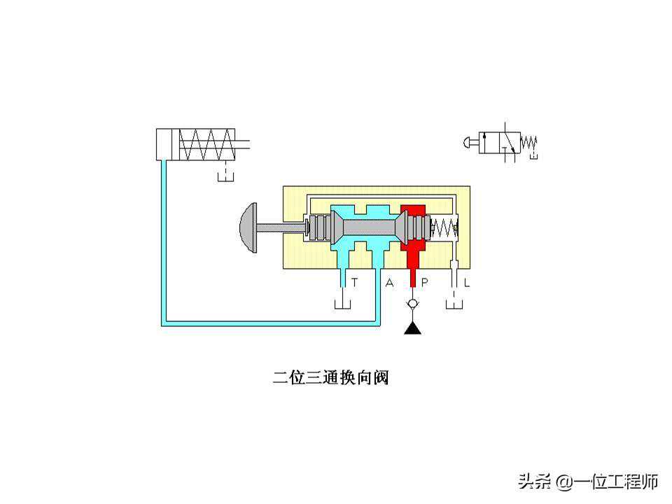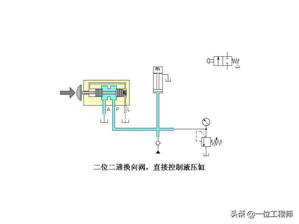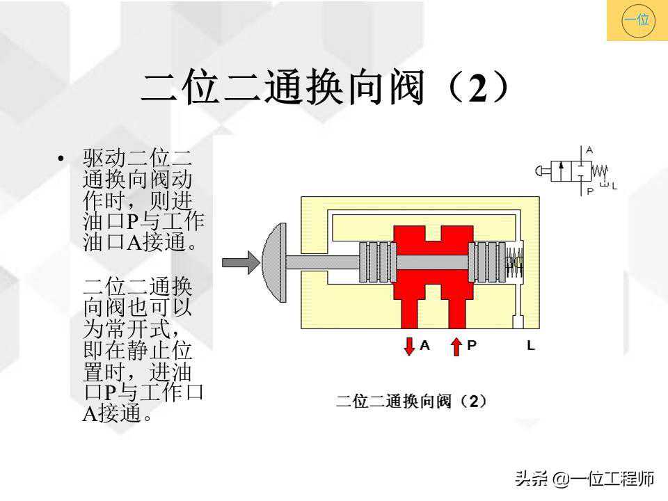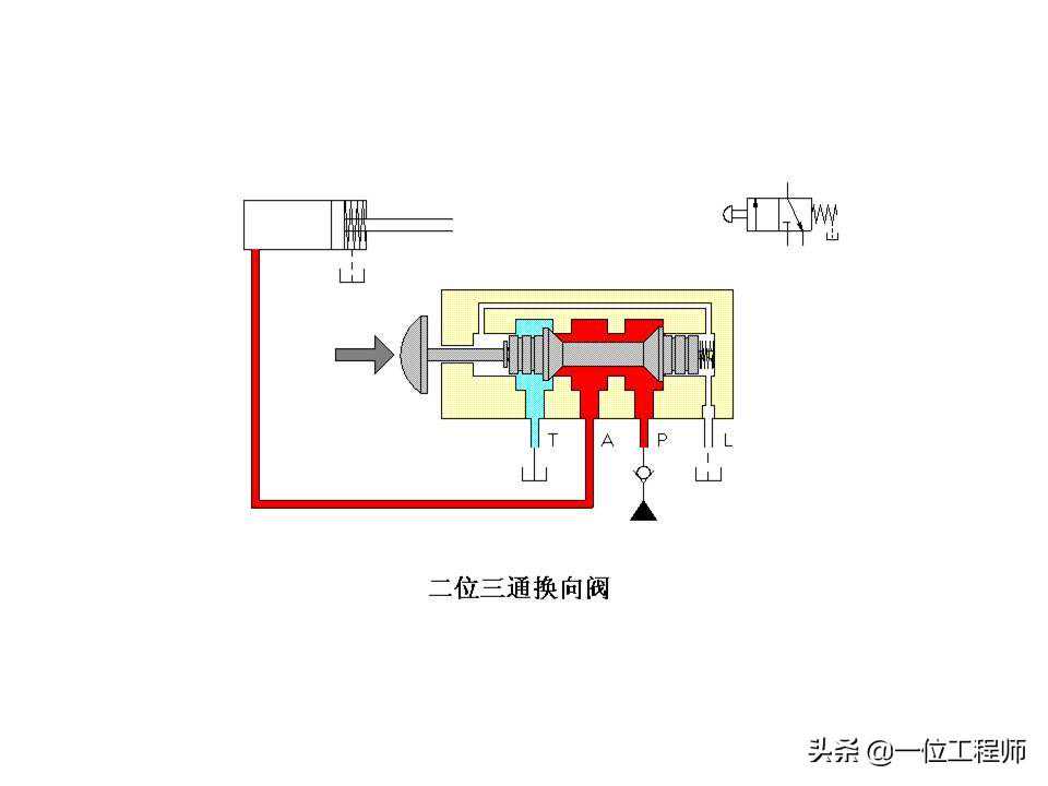 二位二通换向阀具有三个油口,即工作口A、进油口P和泄油口L。在此图示中,换向阀处于静止位置时,进油口P与工作油口A不接通。在泄油口上可连接泄油管路,以泄掉复位弹簧和阀芯腔中的油液。驱动二位二通换向阀动作时,则进油口P与工作油口A接通。二位二通换向阀也可以为常开式,即在静止位置时,进油口P与工作口A接通。