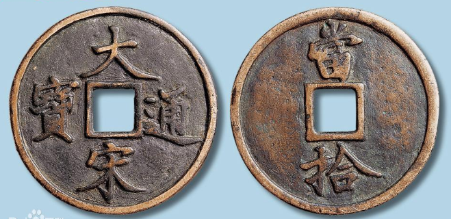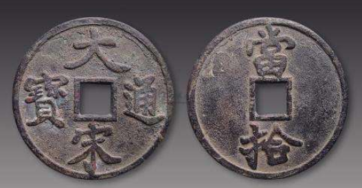 大宋通宝中国古钱币之一,有小平钱和当十大钱两种,其中大宋通宝当十钱位列古泉五十名珍之列,为宋钱中之大名誉品,美品。大宋通宝背纪值钱,乃南宋名泉,其背当拾式,曾授中国古泉五十名珍之爵位,甚为显赫尊贵。时过境迁,至今大宋通宝背当拾,公见有品,早已非存世二三,且银、铜、鎏金皆已呈现。当然,尽管这样,当拾之式,仍可为难得珍贵之品。
