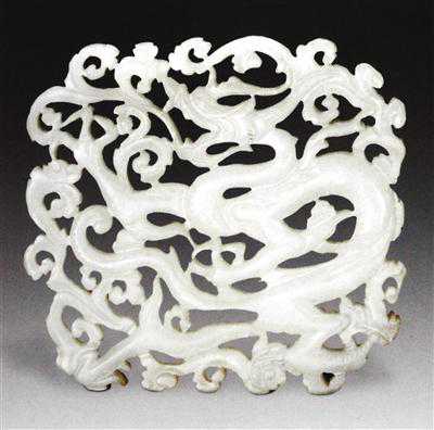 宋代龙纹玉嵌饰,长5.9厘米、宽5.4厘米、厚0.5厘米,故宫博物院藏。这件龙纹玉嵌饰为装饰用玉,玉质白色,正方形,呈扁平状,单面雕琢而成。镂雕一龙,形象逼真,粗眉大眼,巨口怒张,獠牙外露,以阴刻线随意简琢出头上毛发,随风轻扬。龙身躯体自然回环弯曲,张牙舞爪,气象威严,翻腾于卷云之中。