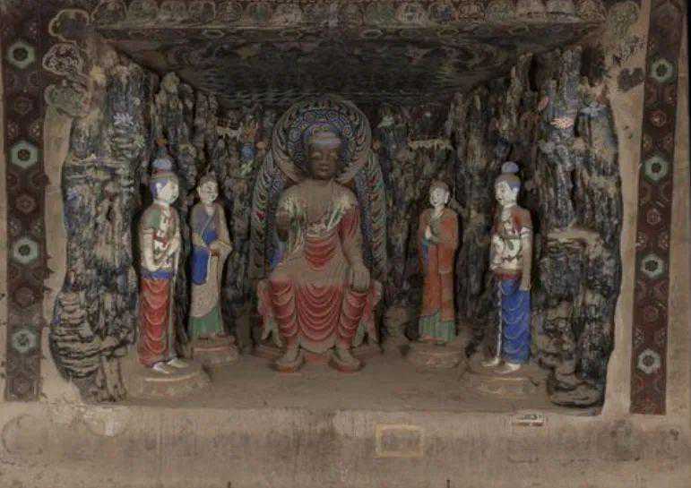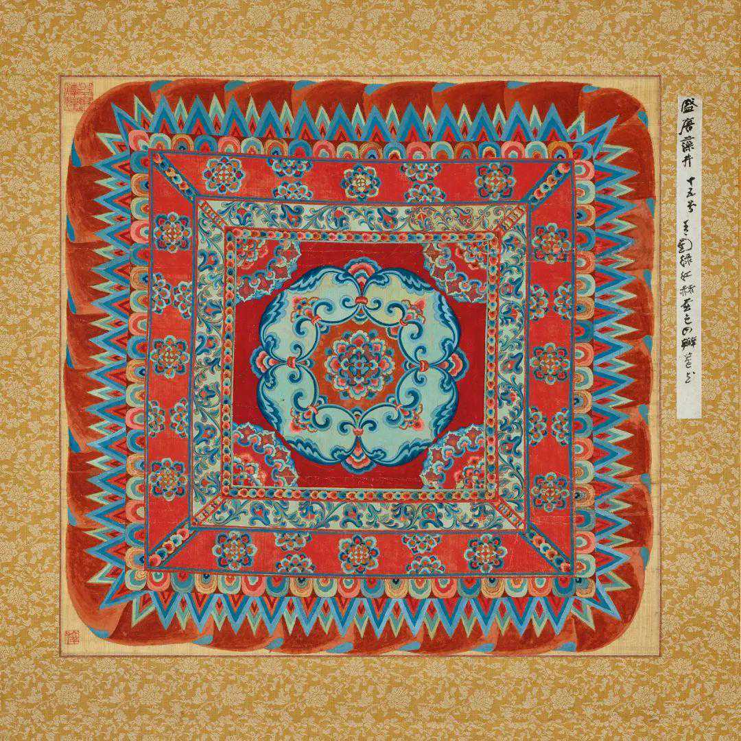 一九四一年初,张大千率子侄门人等远赴敦煌,埋首三载,倾尽心力财力,钻研石窟艺术,摹写壁间彩缋,佛道人物及故事外,纯图案画之藻井自不错过。本幅写于粗绢,考构图可知乃敦煌研究院编号三二三窟主室藻井,该窟以「张骞出使西域」佛教史迹画闻名。藻井艺术在盛唐时期发展至高峰,井心面积缩小,井外边饰、外围垂幔层次增多,团花繁密。井心「青绿红赭套色四瓣莲花」,方井朱色为地,乃盛唐时期特色,四角角花对称,方桁部份绘小宝相花、藤蔓分枝回卷忍冬纹,外围饰鱼鳞纹及垂角纹,纹样丰富,描绘精致,层层相套,色彩搭配艳丽多姿,极富装饰性,充份展现在盛唐时期文治武功鼎盛之时代气息下,「至精至美」、富丽华贵之风采。