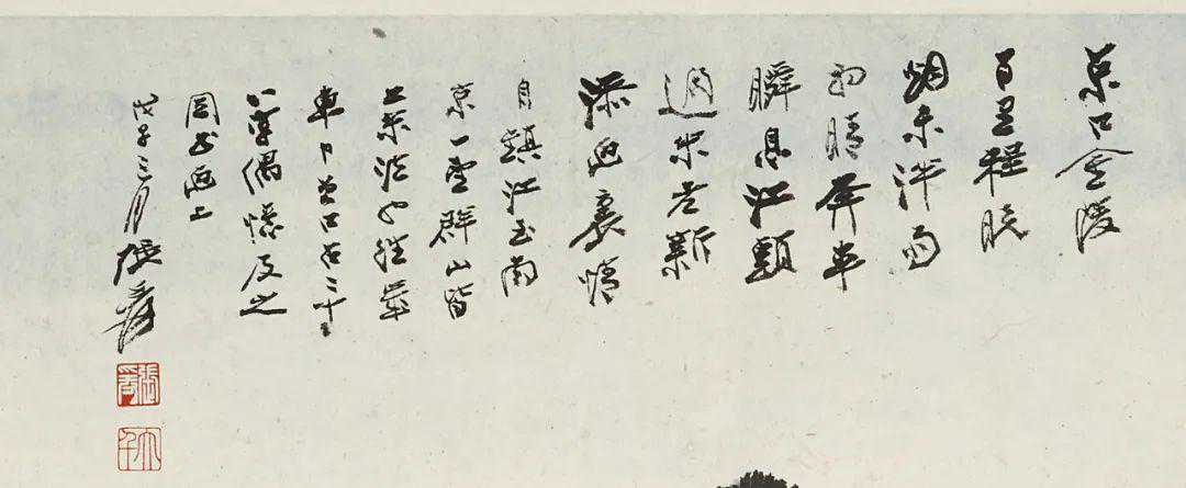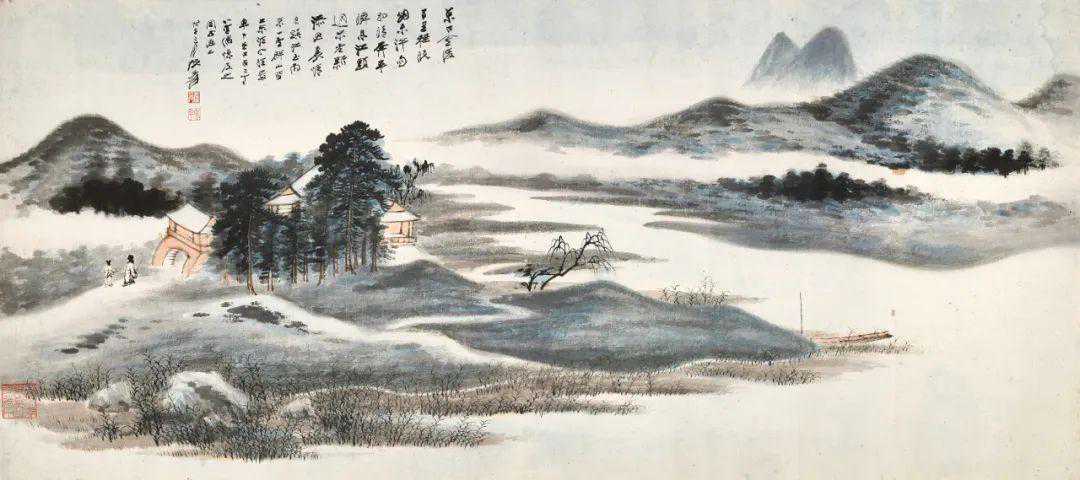 本幅作于数月以后,题谓以镇江、南京沿路所见风光入画。入目一片平远之景,山峦平缓,迤逦不绝,云雾掩映,起伏变幻。洲渚纵横,河水流淌,蒹葭丛生,随风摇曳。岸畔疏树,一叶孤舟,林中栖寺,高士往游,一派江南秀色也。画家取横幅成之,加强山势绵延起伏之变化,平淡天真处,无疑袭北苑,胎息自〈潇湘图〉,惟按画中七絶,时乍「雨初晴」,眼前景象迷蒙,画家「一望群山皆出米法」,故弃披麻,代之米点积染,盖元章父子亦承董源山水法度。画中云山出落沉郁苍厚,岚气清润,意趣高古,在深厚中得澹远之致,倍「添画里情」,可见画家融古得法,参以现实观察心得,笔底神妙,已臻传统笔墨之高峰!画上钤「笑白云多事等闲为雨」印,句出范仲淹〈寄林处士〉,意趣平淡,与南宗山水恰配,画家好钤于拟董巨山水,多见于四十年代中后期。
