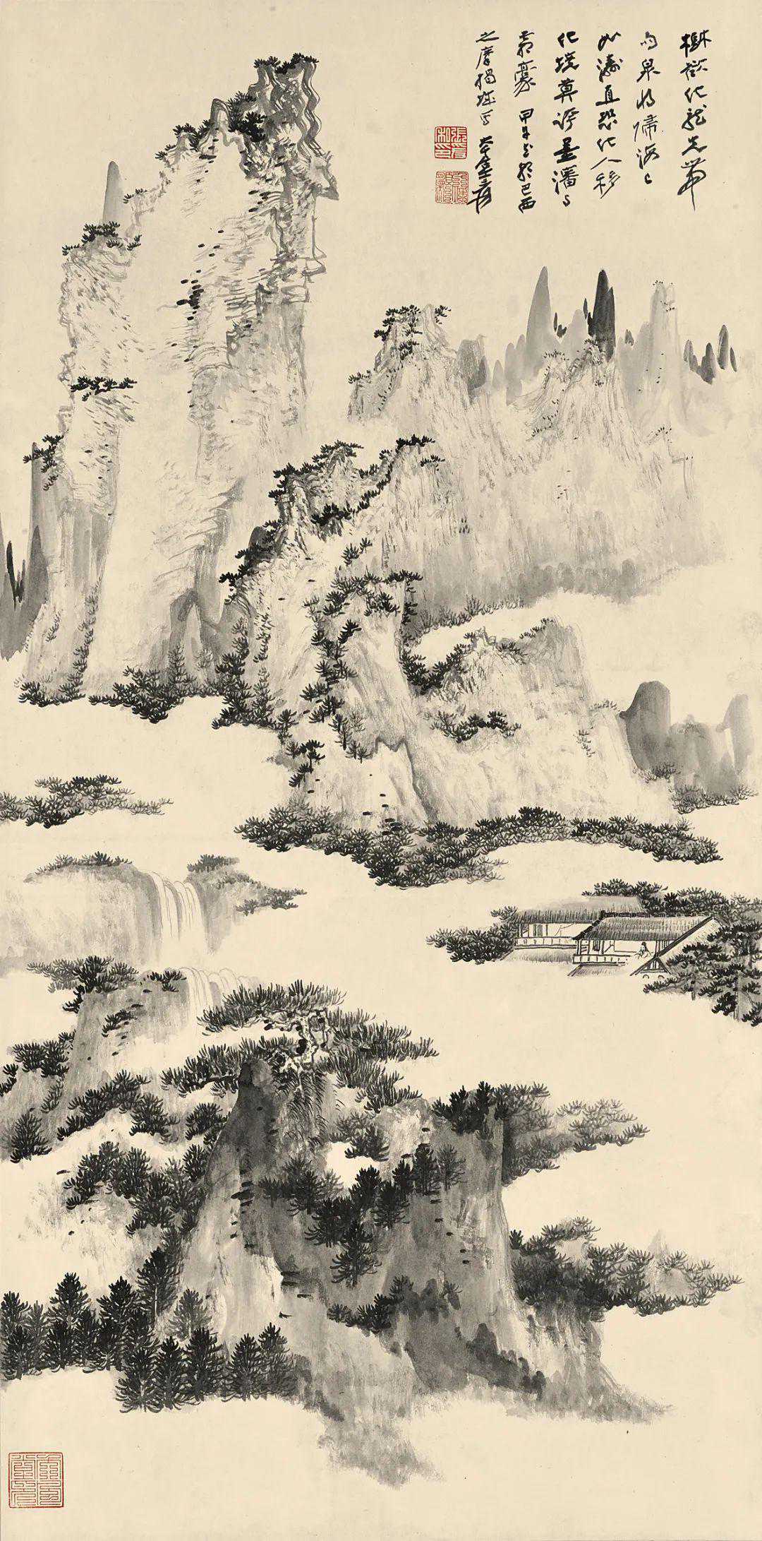 本幅画境见幽谷空壁,秋色笼罩,人迹渺然,惟有松壑盘回,层层积叠,千岩万壑之气象自生。心畬作画重笔远过于墨,笔笔藏锋写山石,勾砍刻画,利落洒脱,无拖泥带水之滞;取石坚介之质,锋棱刚硬,突兀峥嵘,全凭用笔变化,轻重起伏,辨其阴阳明晦;山间缀以杂树,浓墨密笔点划叶冠,全画得疏密宽紧变化,可视为示徒用笔极致之作。
