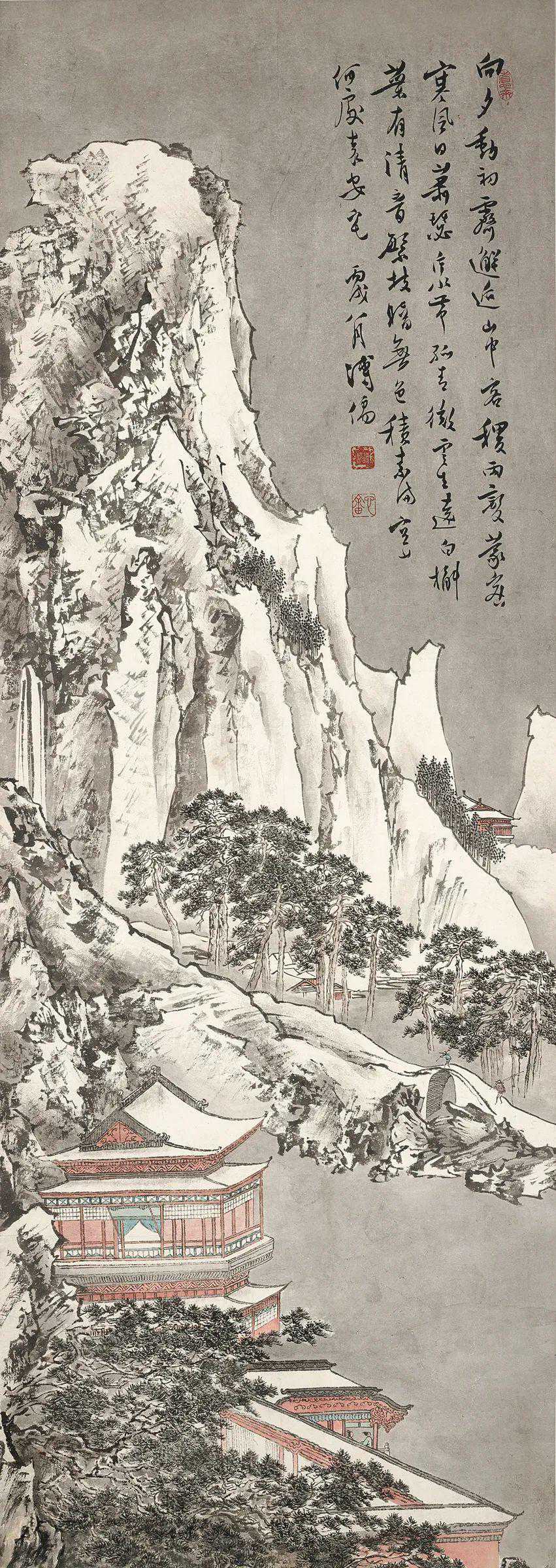 画中年款题「戊子三月」,时维一九四八年四月。翌月初,画家在上海成都路中国画苑举行〈张大千近作展〉,展出作品九十九幅,展品名单中45号,售价五千万,画题即〈京口道中小景〉。从画面内容、写成时间,以至下笔之用心,可推之本幅或为是次展览而出。