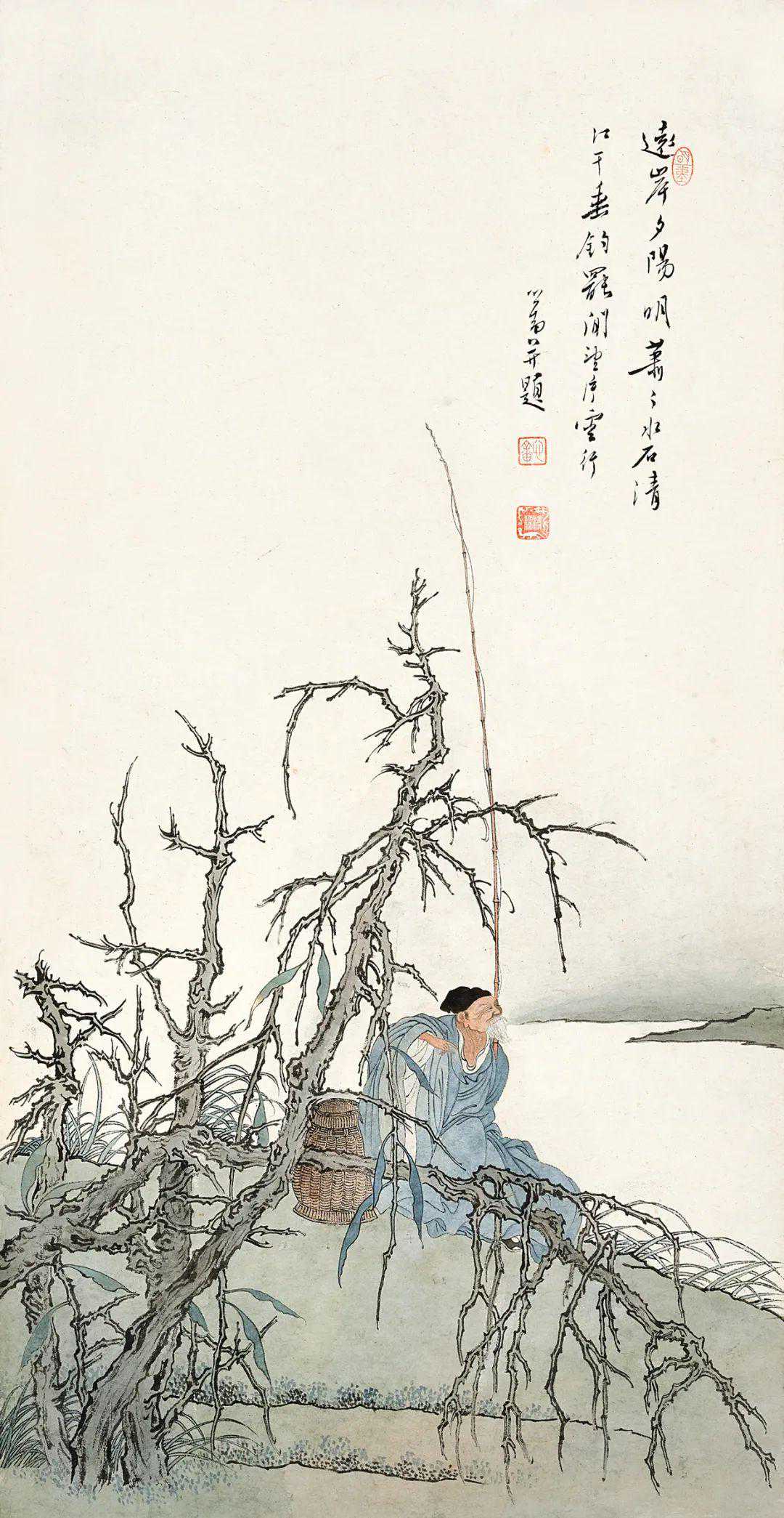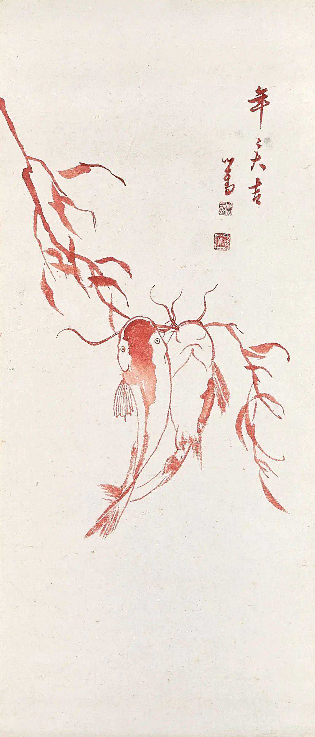 溥心畬系出贵胄,意趣恬淡而无心仕途,毕生涵泳于笔砚之间,常有游戏之作,聊以自娱。本幅以朱笔写出,幼枝斜伸,鲶鱼配对,一正一背,似跃水而出,衔枝并挂,构图奇特,盖画家取鲶谐音「年」,成双则「年年大吉」,创意灵巧,令人会心一笑。
