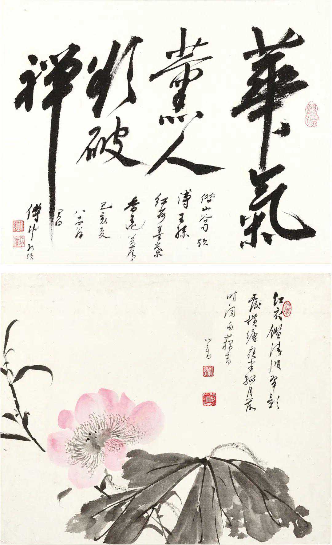 画上折枝牡丹两株,或含苞,或怒放,轻重相衬,绿叶浓淡交融,水份与色墨晕染淋漓,尤见笔墨酣畅之妙。画上题徐青藤句,首句本为「墨染娇姿小绛匀」,因本帧以胭脂敷瓣,遂改为「淡抹香腮淡点唇」,足见画家处理常见题材之巧思。