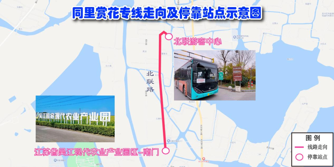 可乘坐7103路、7105路、7118路至“同周路口”站,往北30米至吴江现代农业产业园区(南门),换乘“同里赏花专线”至北联游客中心。
