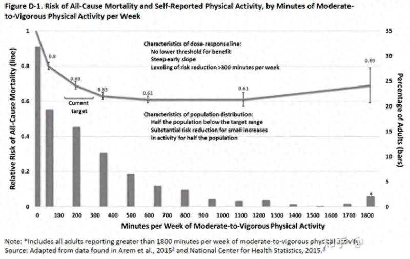 运动量与健康获益之间存在着曲线关系。运动是有益的。人们不需要达到150~300min目标范围的下限,就可以从定期的体育活动中受益,多运动会受益更多。超出目标范围的个人通常会获得更大的健康益处。完成超出目标范围的运动量,风险还会进一步降低,大约一半的成年人可以通过适度增加中到高强度身体活动使风险降低更多。但完成过多的运动,受益幅度反而会降低并有可能带来风险和危害。