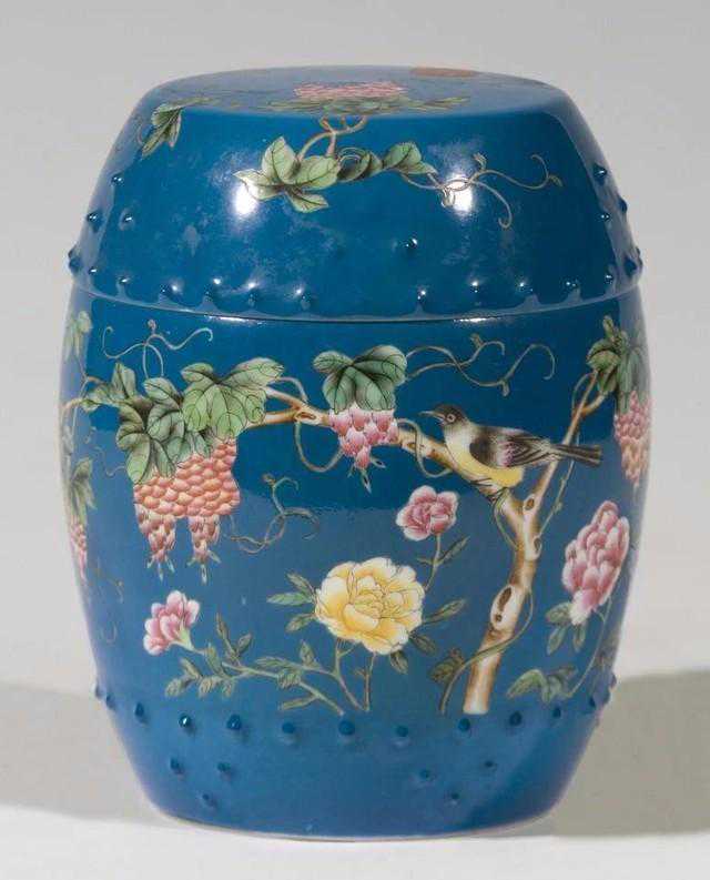 鼓罐:流行于清代康熙至道光年间。器形似鼓,一般无盖,罐身上下部各饰一周凸起的鼓钉,腹部巾塑一对铺首衔环。唯有雍正朝的开蓝釉鼓罐器口配盖。