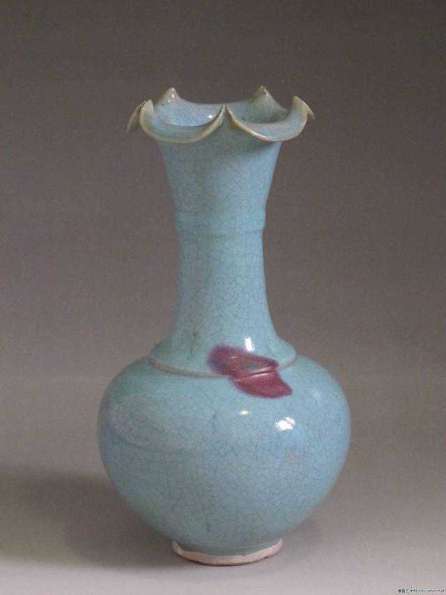 玉壶春瓶:又叫玉壶赏瓶,是宋瓷中具有时代特征的一种典型器物。流行地区广,沿用时间长,宋以后历代各地窑场均有烧制。它的造型是由唐代寺院里的净水瓶演变而来。基本形制为撇口、细颈、垂腹、圈足。它是一种以变化柔和的弧线为轮廓线的瓶类。其造型上的独特之处是颈较细,颈部中央微微收束,颈部向下逐渐加宽过渡为杏圆状下垂腹,曲线变化圆缓;圈足相对较大,或内敛或外撇。这种瓶的造型定型于宋代,历经宋、元、明、清、民国直至现代,成为中国瓷器造型中的一种典型器物之一。