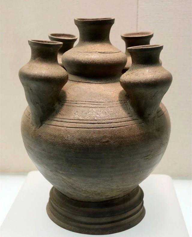 五联罐:是流行于东汉时期的陪葬冥器。造形为中心大罐周边四只小罐或壶,腹间互不贯通。此外器身还堆塑各种珍禽瑞兽。罐盖有双线半环钮或鸟形钮两种。五联罐在三国以后演变为堆塑楼阁的谷仓罐。