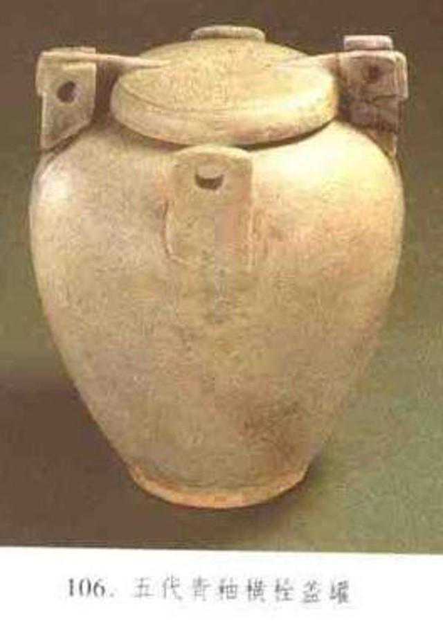 横栓盖罐:又称夹耳盖罐、夹梁盖罐。广东番禺石码村五代南汉墓出土的盖罐,直口丰肩,以下渐收,长圆腹,圈足。肩部有两对对称的板式带孔钮座。盖两侧对称的位置伸出长方形带孔横栓,盖合时横栓插入钮座,与钮座的轴孔相合,可以在两孔中插销固定,或只固定一侧的轴孔,器盖能自由开合而不脱落。