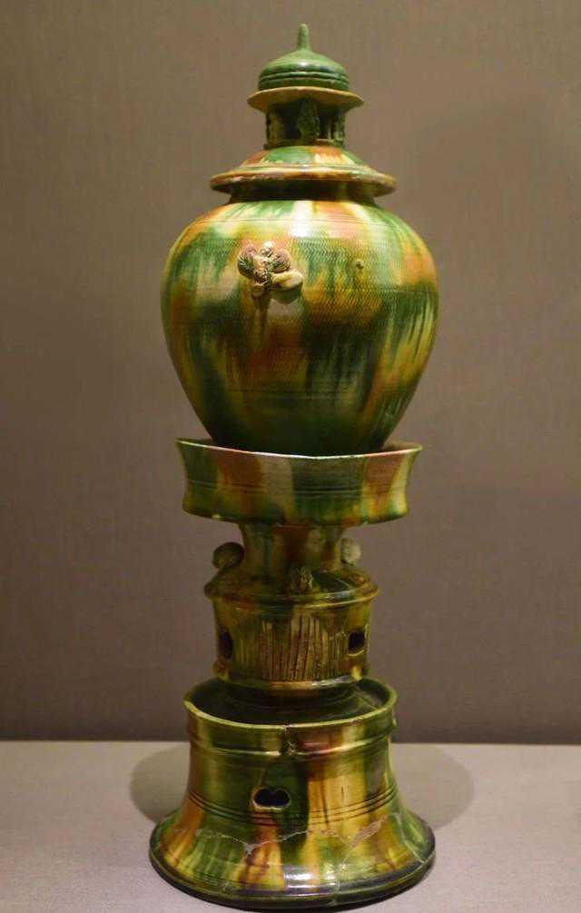 塔式罐:带有佛教特征的罐式,多由罐和罐座两部分组合而成,流行于唐代。陕西铜川黄堡镇出土的黑釉塔式罐,翻沿唇口,短颈溜肩,圆腹,腹下部渐收,贴有模印叶纹。镂空多边形底座饰有佛像、花卉等。盖为七级空塔形,顶端塑有屈腿直身、抚头按膝、舒目远眺的小猴。