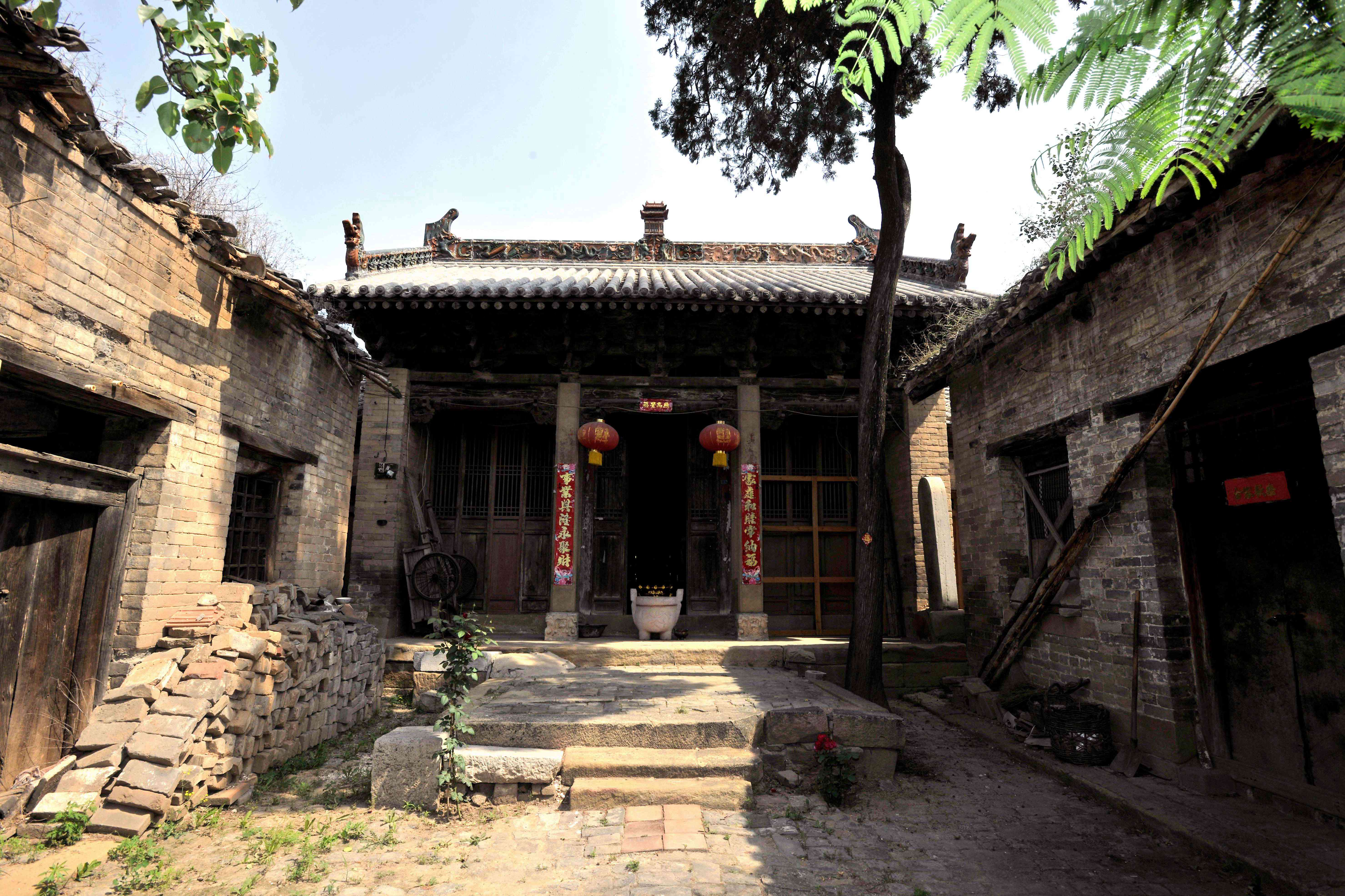 良户古村以祖师庙到观音堂为中轴线,西接西街、后街、太平街,东接东街和蟠龙寨。这是一座有着悠久历史记忆的村庄,早在唐代中叶,就有郭、田两姓家族在此建庄,始称“两户”。宋初,陆续有王、李、秦、赵、张等姓迁来,村落不断扩大,至元时已初具规模,村名也由“两户”改称“良户”。不过村中还有一种说法,村人介绍,详考村中现存历代碑刻了解到,良户一名取义吉祥,是因村落选址于三架大山梁上,形似凤凰展翅而得。为考证这一说法,记者随村民爬到村外的山岭之上,在村民的指点下远眺良户古村,隐约之形状果然极似凤凰。位于村中岭上的双进士院是凤头,东西两街为双翼,鸽子院后院是凤尾,田家后花园白果园则为尾翼。