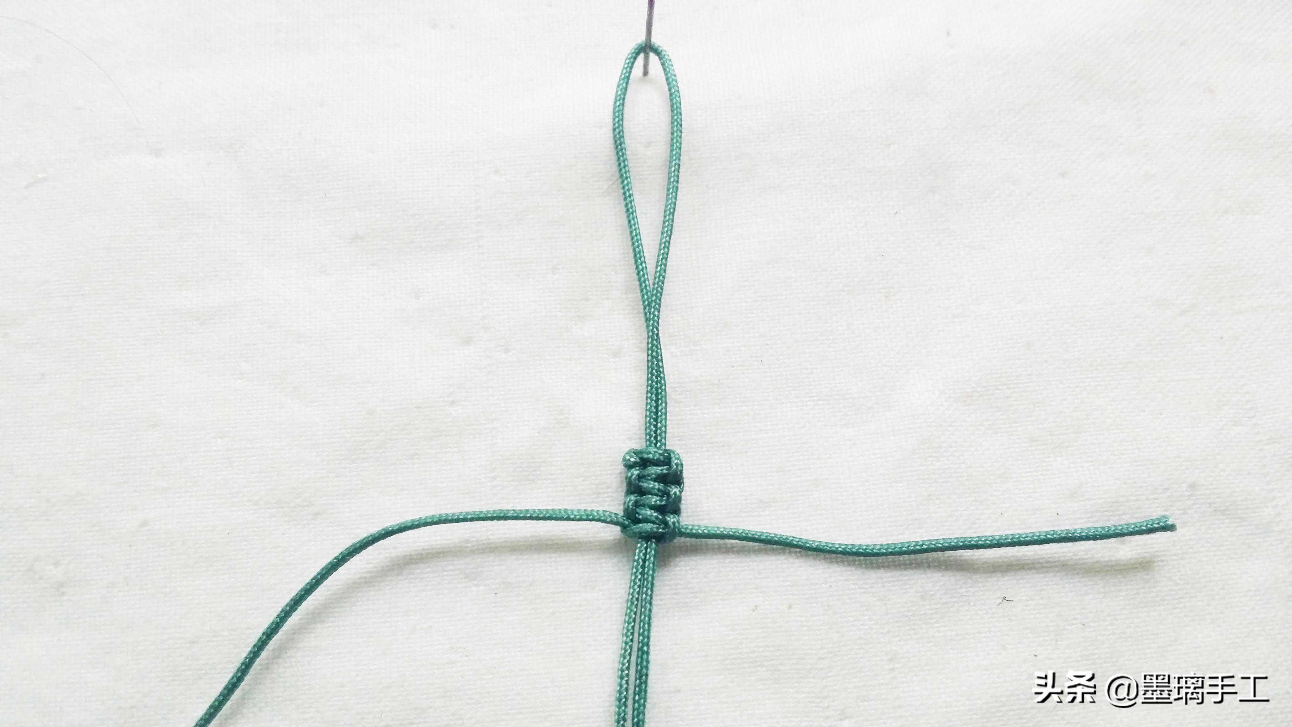 1.蓝绿色线:50cm×1对折固定在泡沫板上,做轴线。在7cm的地方加1条15cm的线做绕线,编3个平结。如图: